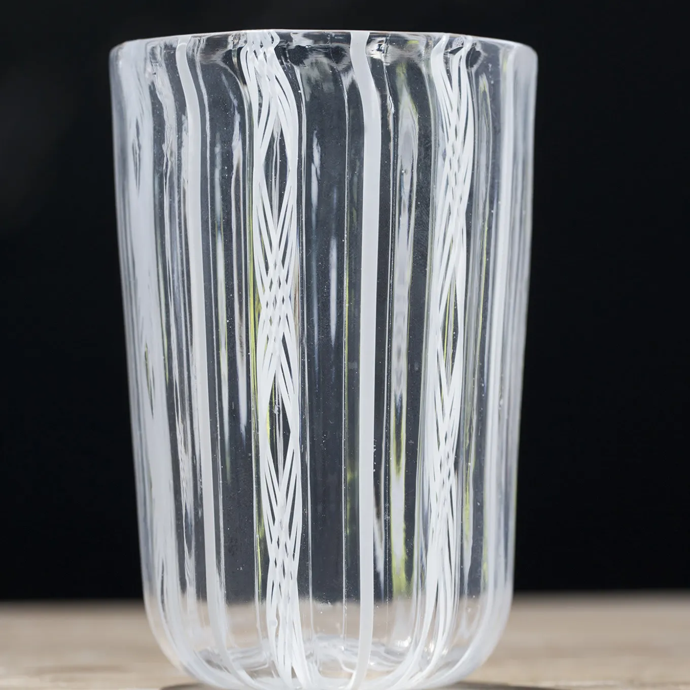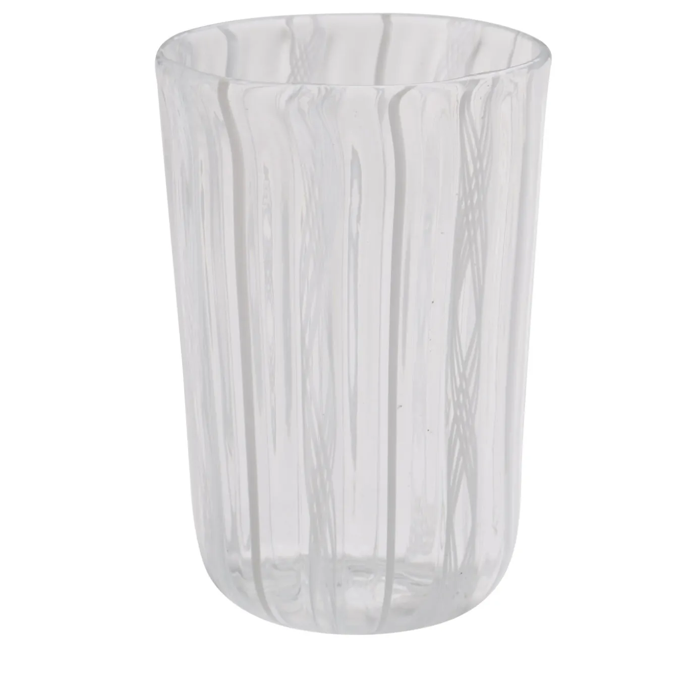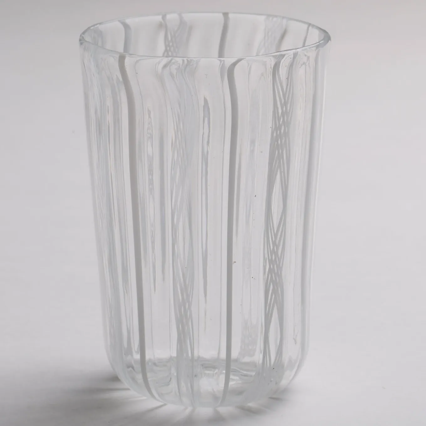 Set of 6 filigree Murano glasses made with the “a Canna” technique, where canes of colored glass are melted into a clear glass base. This beautiful white set includes 6 glasses entirely handcrafted on the Venetian island of Murano by the master glass blowers of La Fornasotta. The filigree glasses are usually considered the most precious among all Murano glasses.
