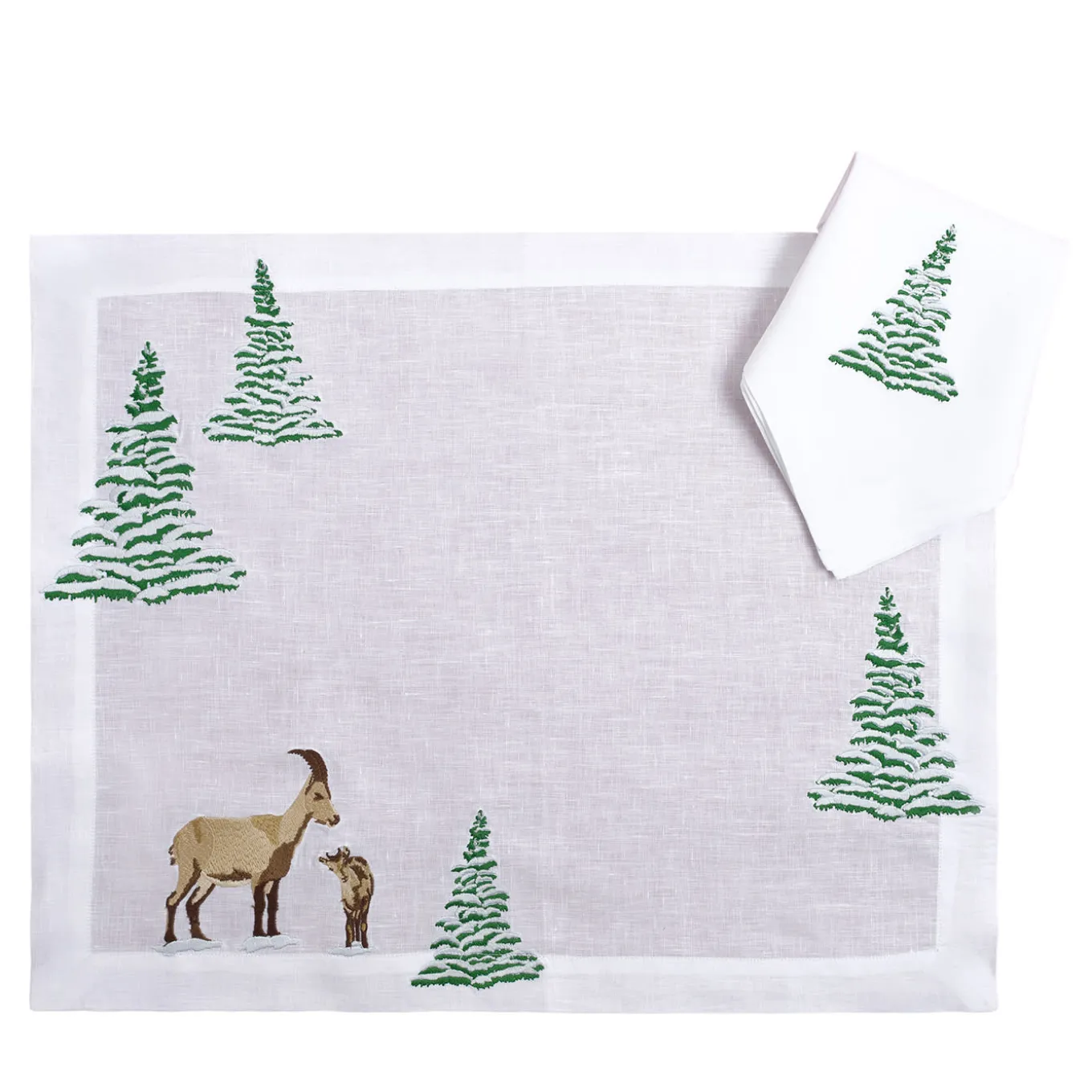Rectangular embroidered placemat set, including one placemat and one napkin (45x45cm), crafted from high-quality linen. Perfect for everyday use or special occasions, these placemats bring a touch of rustic elegance to any table. Featuring charming mountain animal designs, they are ideal for mountain lodges, cabin-inspired décor, or as a thoughtful gift for nature lovers. Reflecting Maison Alia’s dedication to fine craftsmanship, these placemats add timeless beauty to the table setting.