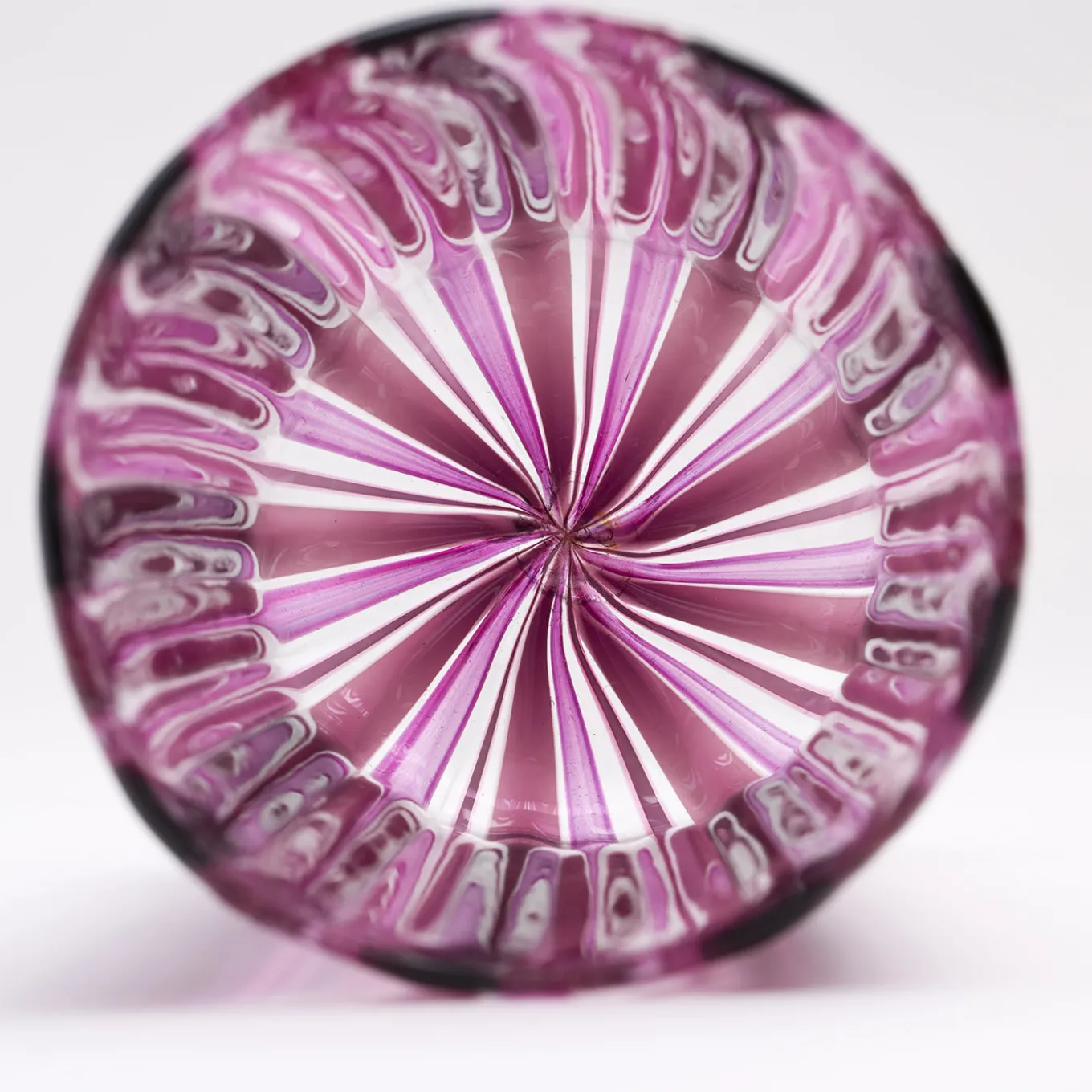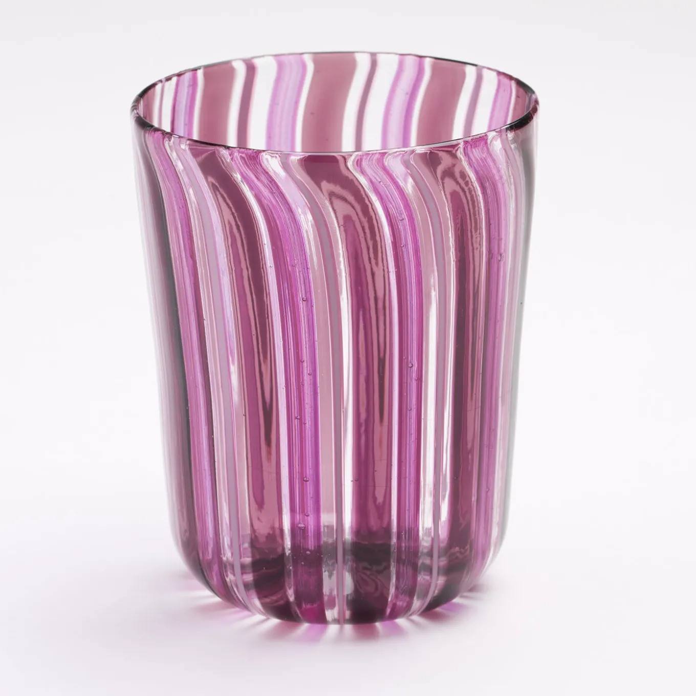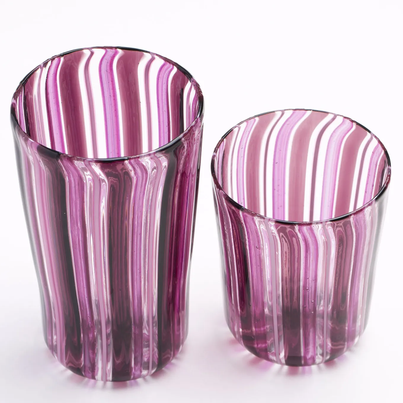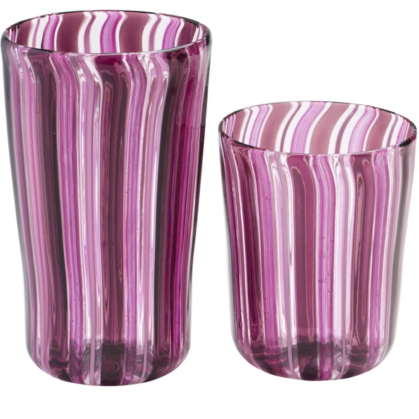 Set of 12 Murano glasses made with the “a Canna” technique, where canes of colored glass are melted into a clear glass base. This beautiful amethyst and pink set includes 6 water and 6 wine glasses entirely handcrafted on the Venetian island of Murano by the master glass blowers of La Fornasotta.