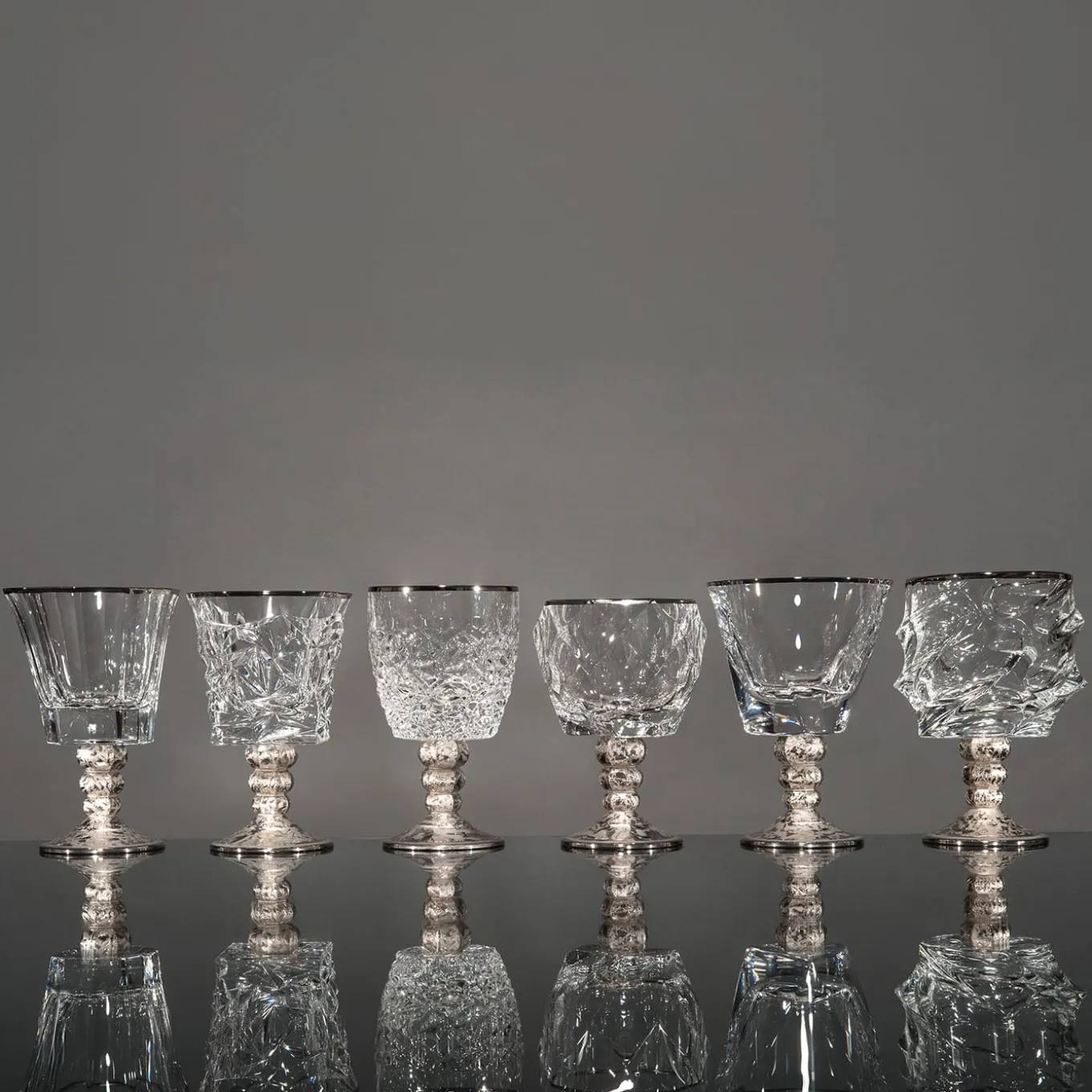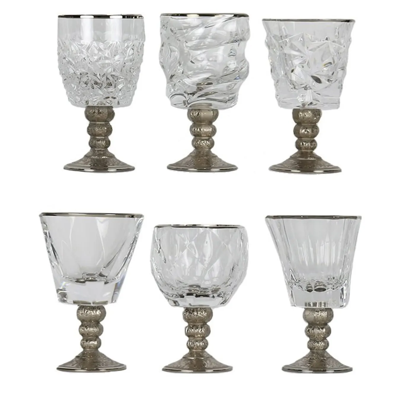 This set of six chalices is part of the Capriccio collection and can be combined with the other pieces from the same series to create a striking effect. Each piece of this set features its own shape with unique textures and abstract decorations carved on the solid glass. The rims of the base and top of the glasses were hand painted using platinum and this luxurious touch, along with their contemporary shapes, makes them a precious and sophisticated addition to any dining experience.