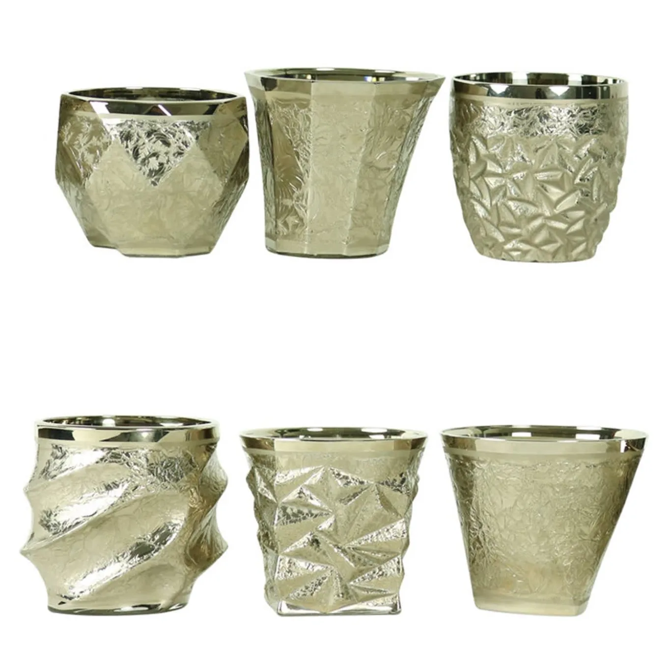 This set of six glasses is part of the Capriccio collection and comprises assorted pieces that are each a one-of-a-kind objects of functional design. They were carved from solid glass into six striking shapes that create abstract decorations on the surface of each piece, producing unique textures and reflections. The set was then hand painted using platinum, whose luxurious glares will add a sophisticated touch to any table. Ideal for water or after-dinner liqueurs.