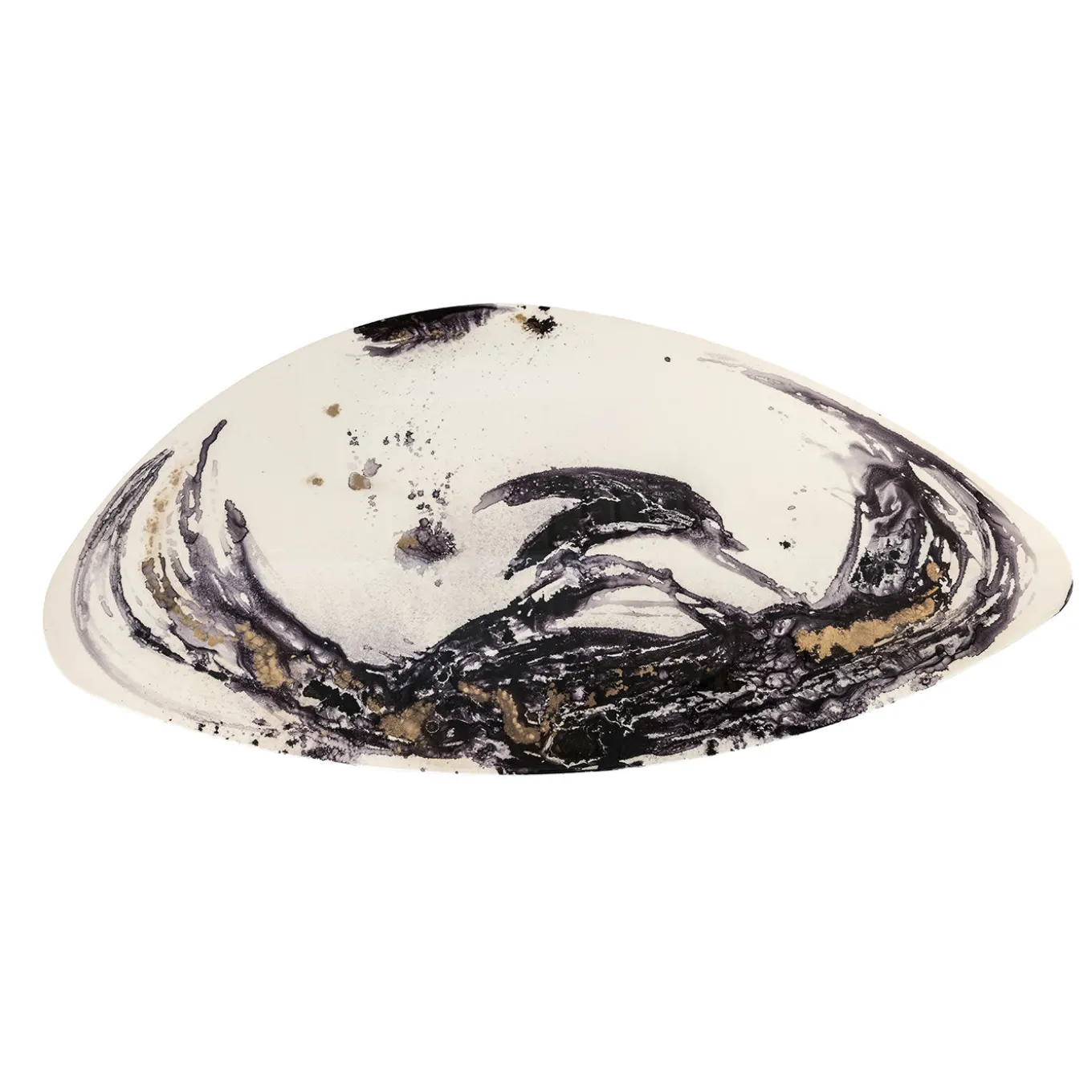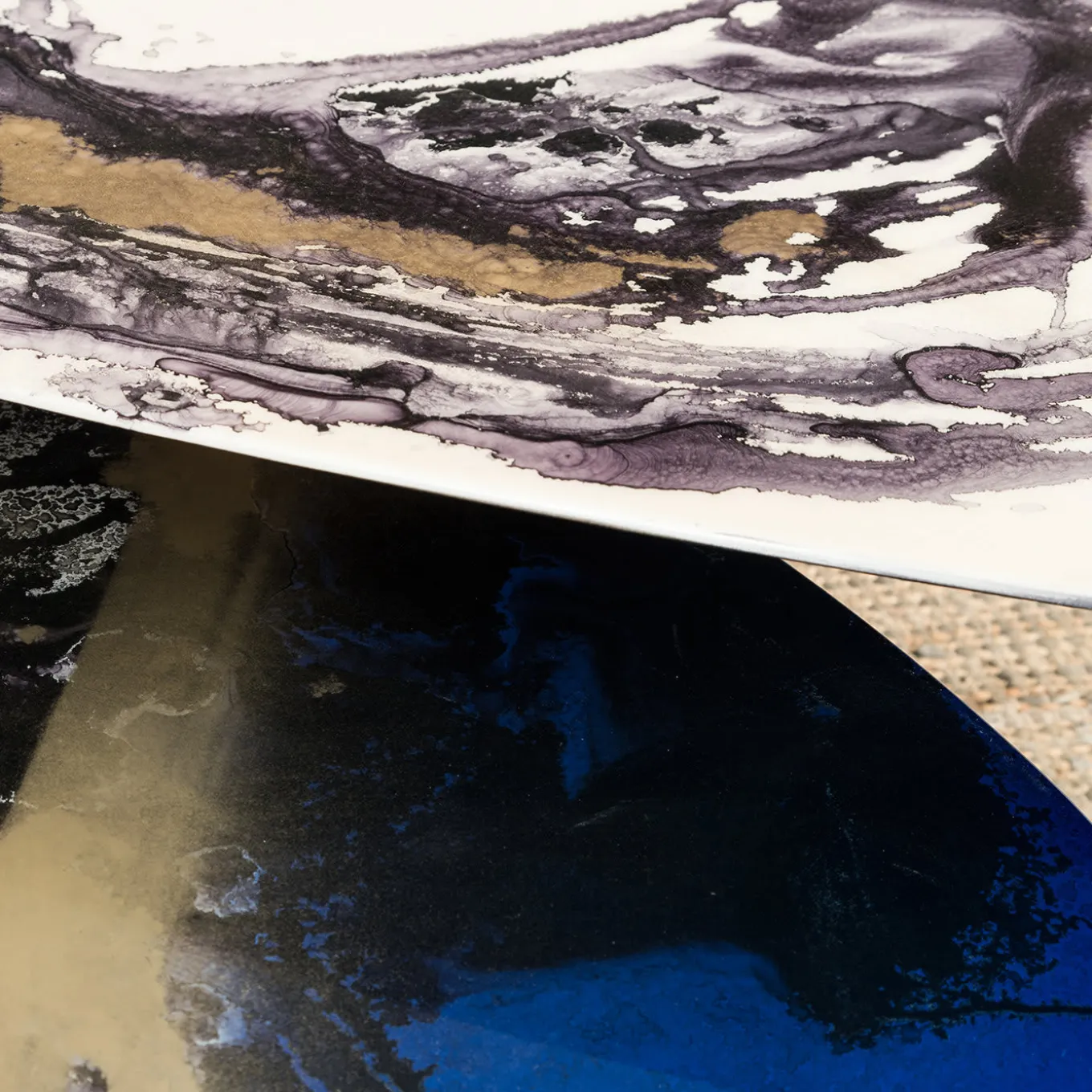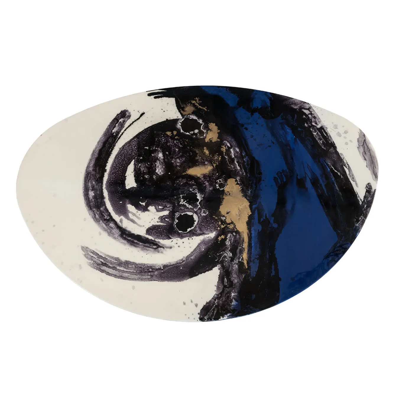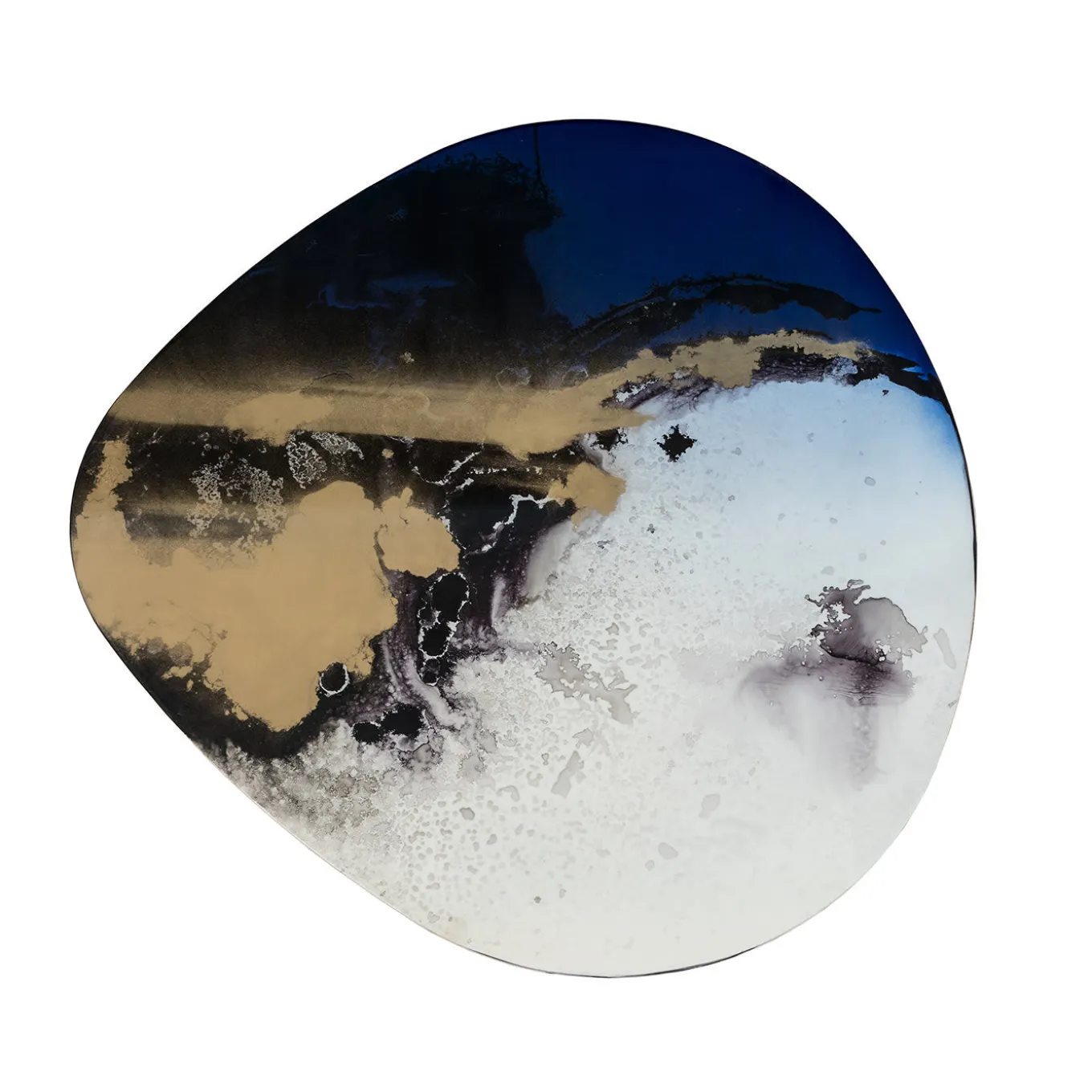 This set of three coffee tables feature a blend of different curved surfaces for a unified but individualistic effect. Made from polyester, which is hand-painted with a brushstroke motif. Their wooden legs are tipped in brass. As each piece is painted by hand, no two items will be alike, although they will be similar to the item’s photo. Customizable.