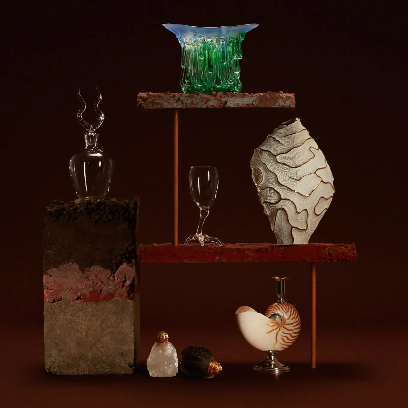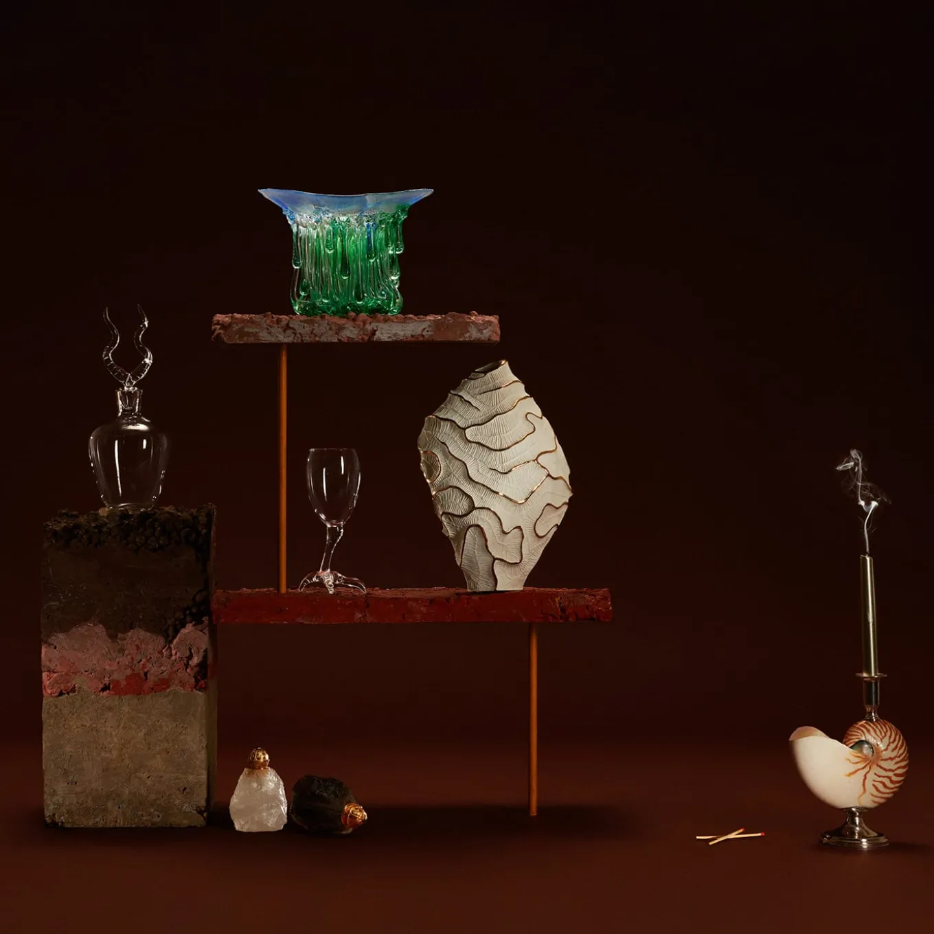 Collection of Gajna table objects composed of liquor bottles, martini glasses, and ashtrays. The vices are represented by their uniqueness.