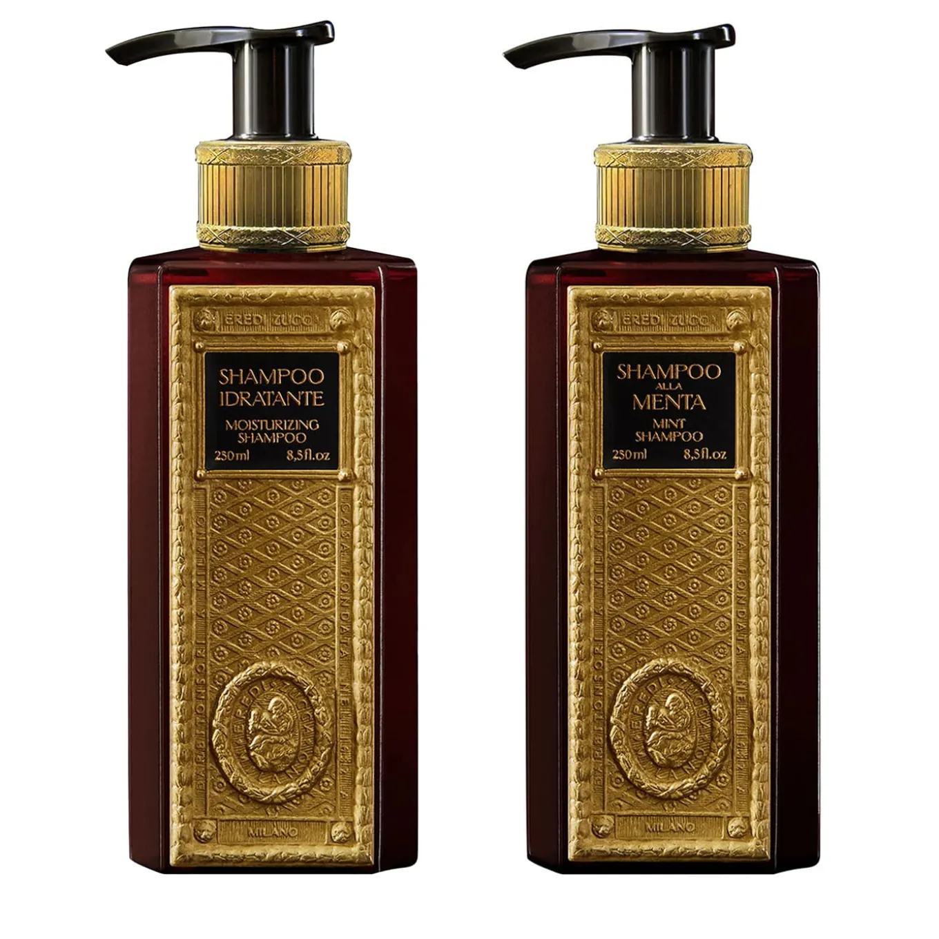 The Eredi Zucca shampoo set offers a perfect balance of refreshment and nourishment. The mint shampoo, enriched with menthol, coco-glucoside, and glycerine, provides a luxurious, hydrating cleanse, while the moisturizing shampoo, infused with glycerine, guar gum, and wheat protein, restores vitality to frizzy, damaged hair. Both feature the woody-citrus Vetiverum fragrance and come in elegant 250 ml burgundy PETG bottles adorned with brass Eredi Zucca details.
