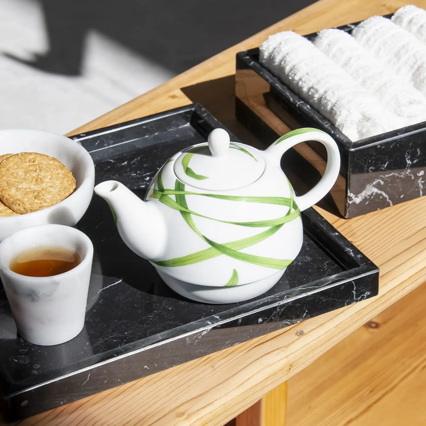 Set composed by one spa tray (26,5×26,5x2cm) and one towel tray (17,5x17x6cm) in black Marquina marble, one small bowl (12,5x5cm), and one small glass (6x6cm) in white Carrara satin marble. Each piece is in a way unique, slight variations in shape, color, and size are to be considered a guarantee of a handmade creation. It’s important not to use lemon or vinegar on it, clean only with water and natural soap (like Marseilles soap), do not put it in the dishwasher.