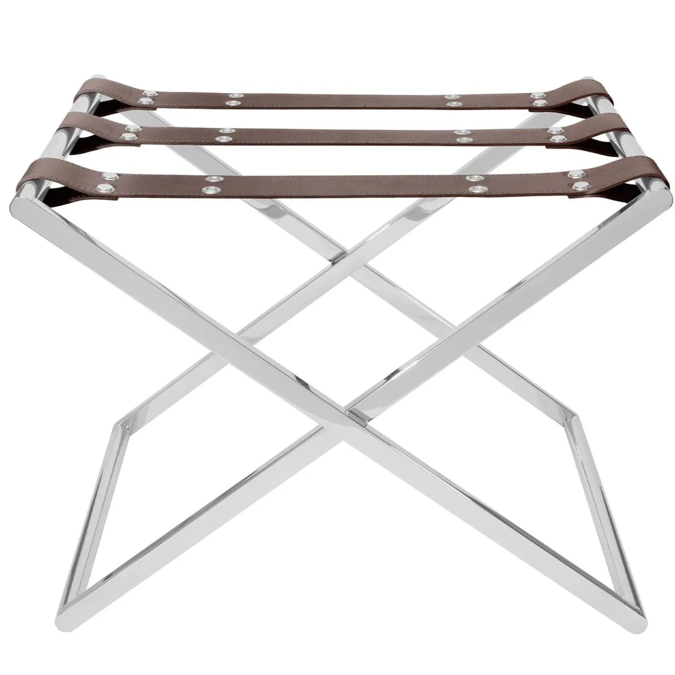 Folding luggage rack with 3 leather straps. Chrome or gold metal legs with adjustable height.
