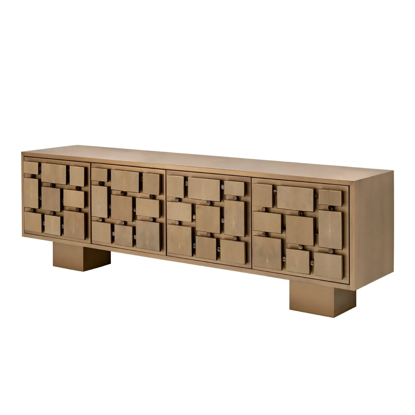 A majestic blend of metal and wood, this sideboard will make for an elegant and striking accent piece to display in a contemporary living room or private study. Featuring four doors, it is handmade of wood covered with galvanized steel finished in a satin bronze hue. It is exquisitely enriched with dark rose gold-finished and breed leather inserts of bold geometric value.