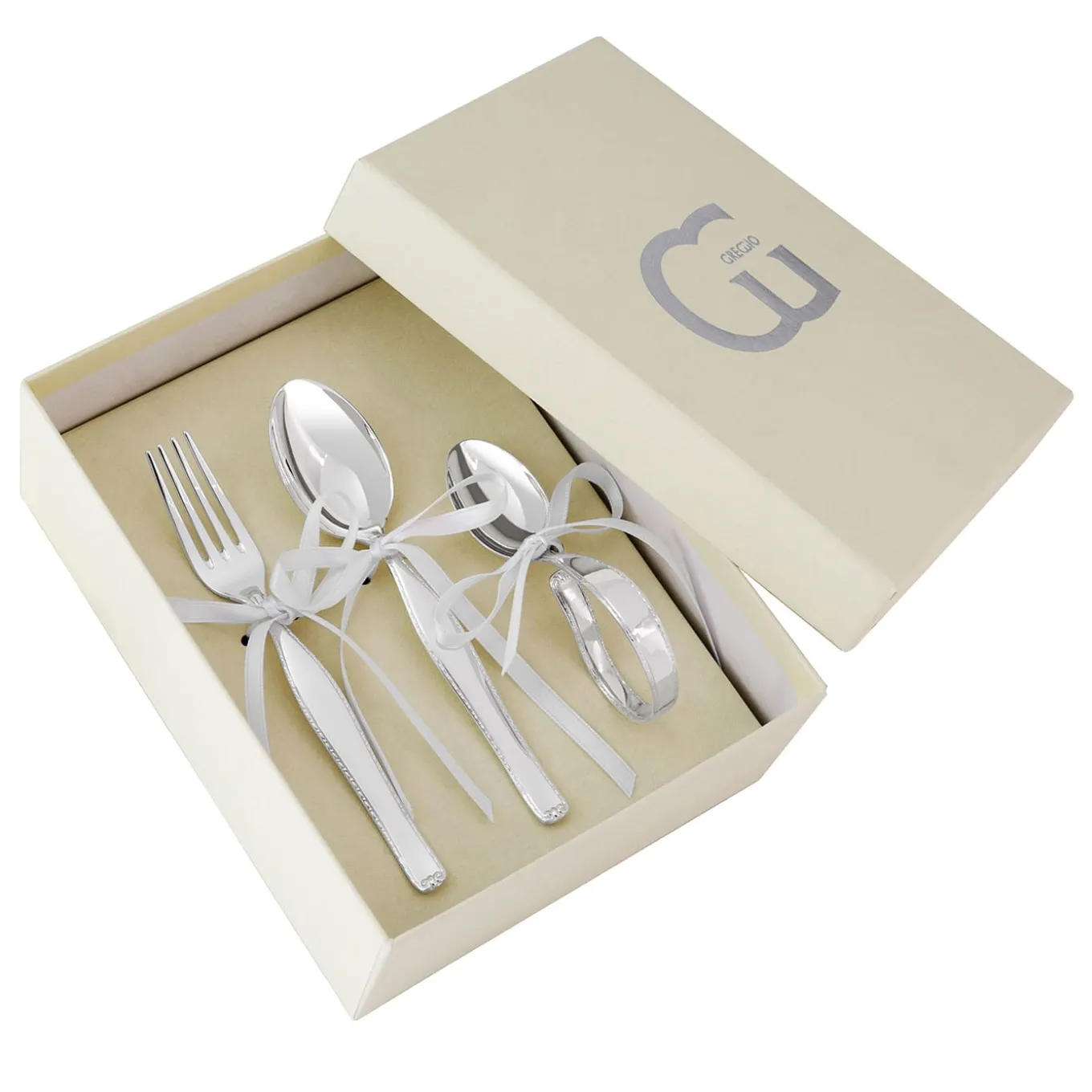 A design made to witness important steps in babies’ development that will be treasured for years to come as a tender childhood memory, this set features a baby fork, baby spoon, and baby spoon with bent handle. This will be a stunning gift for a baby shower and comes in an elegant case (included in delivery).