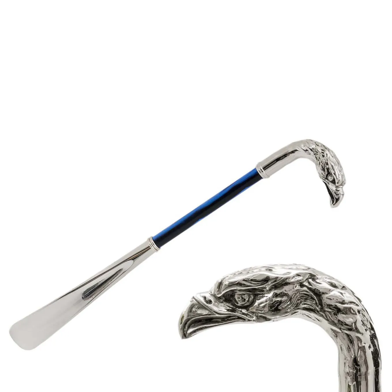 The Silver Eagle Shoehorn features a metal handle representing the head of this “King of the Skies”. Unique and stylish in design, it has a PMMA shaft and an ABS end and at 50 cm in length is entirely handmade in Italy.