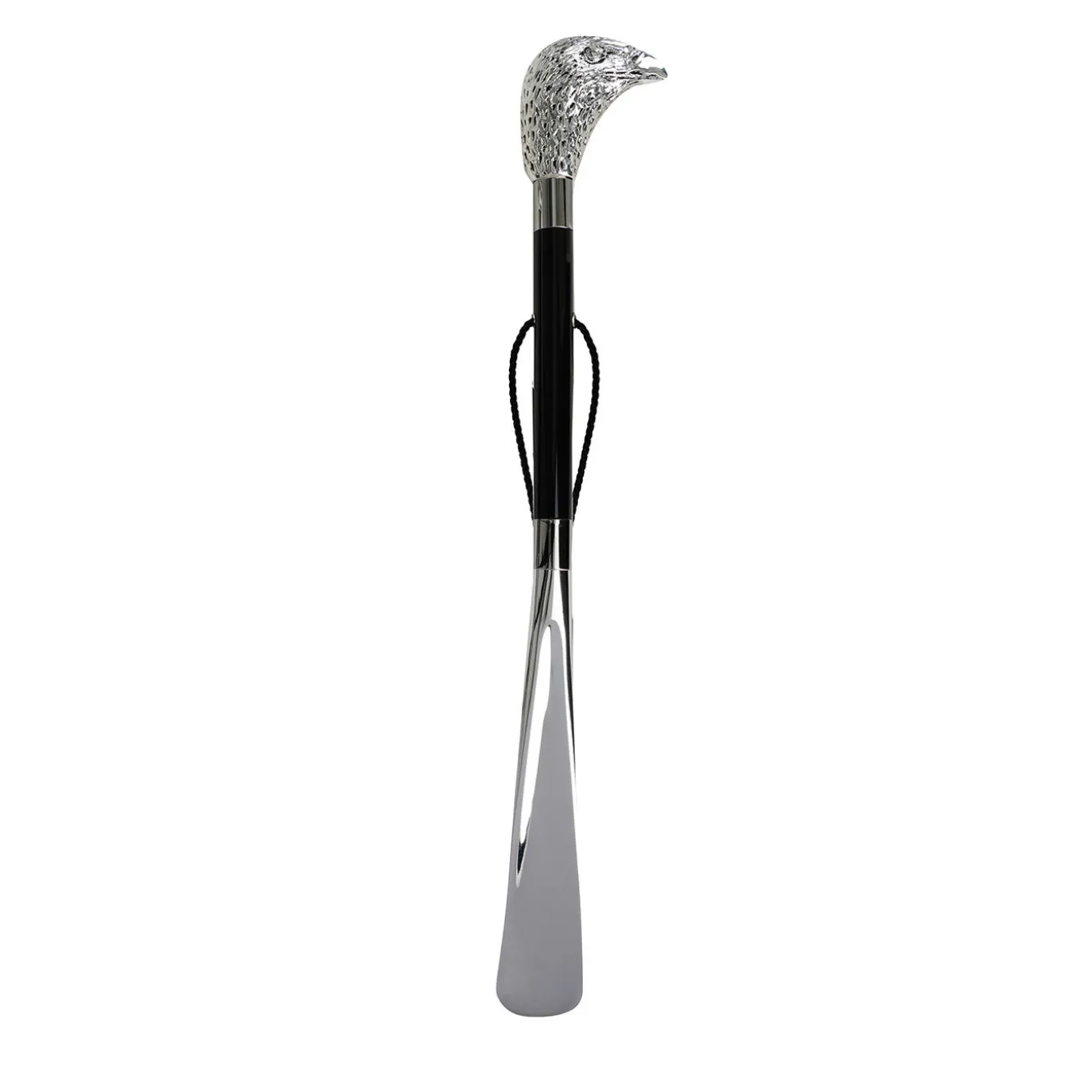Coming in a precious branded case, this handcrafted shoehorn has its ornamental focus in the luminous handle shaped like an eagle’s head made of powder-coated marble with sterling silver details. Meticulously crafted, the grip is combined with a solid beech shaft lacquered in glossy black and with a silvery paddle in ABS smoothly guiding the foot in the shoe. Silver-finished brass rings and a fabric loop for easy hanging complete the structure.