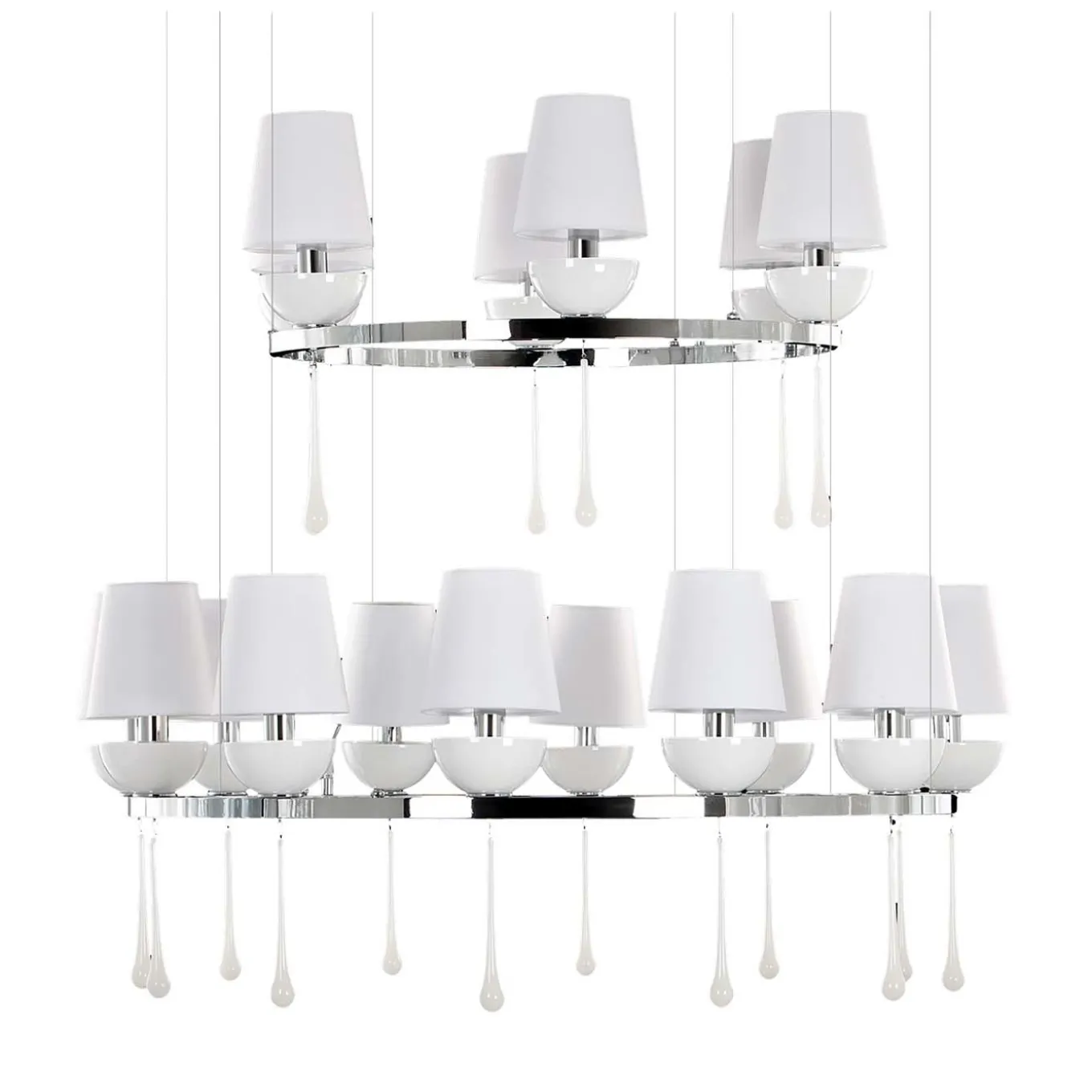 Merging traditional elements with modern flair, this sophisticated chandelier showcases a two-tiered structure of polished chromed metal with two large circular frames displaying 6 and 12 lights (each E14 max 5W) respectively. The crisp white shades are complemented by the cup-shaped bobeche in hand-blown white glass, each embellished with a white Venetian glass droplet dangling from the base. A testament to elegant simplicity, this magnificent piece is especially suited for modern or mid-century-inspired interiors.