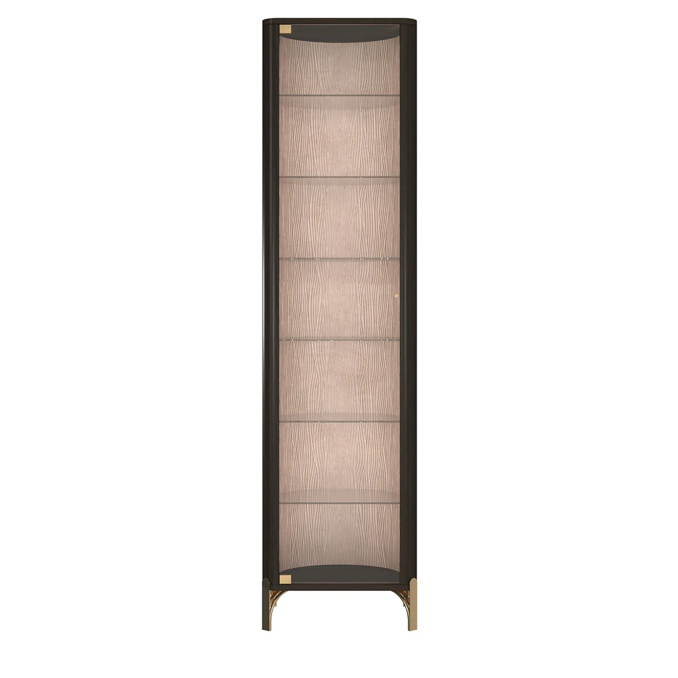 Single door glass cabinet featuring integrated led lighting and seven spacious shelves with glass panels. Designed with a simple, essential style suitable for living rooms, hallways, and bedrooms. It includes a fabric-lined interior with a textured cream pattern and metal feet for a refined touch. The cabinet’s structure allows for practical storage display while adding subtle elegance to any room.