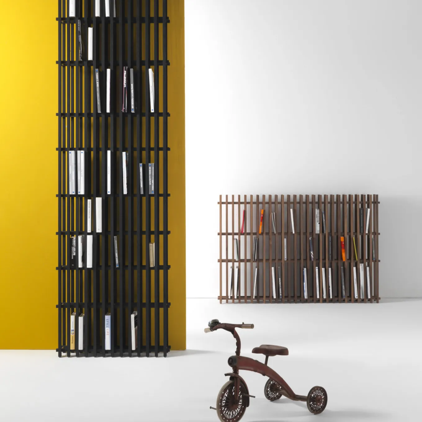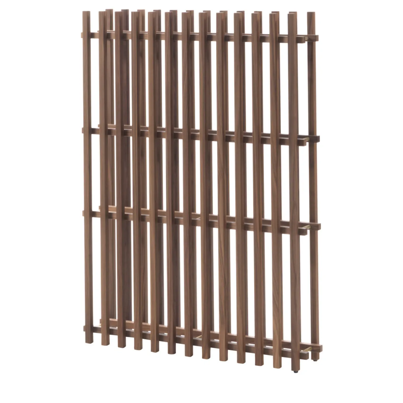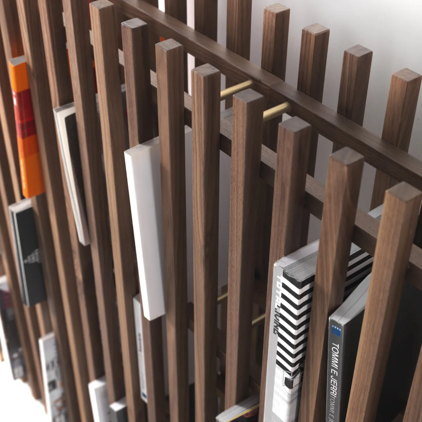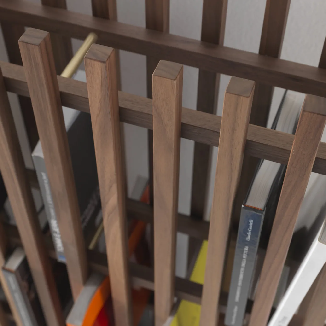 Minimalist and sophisticated, this bookshelf can be directly put on a wall or in the middle of a room as a divider. Its light silhouette and exquisite craftsmanship make it a striking piece of functional decor that recalls the facade of a building, a three-dimensional boiserie. Entirely made in canaletto walnut, this piece is comprised of two vertical panels that frame four horizontal shelves. Its versatile shape can have different heights and can be made also in natural durmast oak or durmast painted black. Please consult the concierge about possible changes in price for customization.