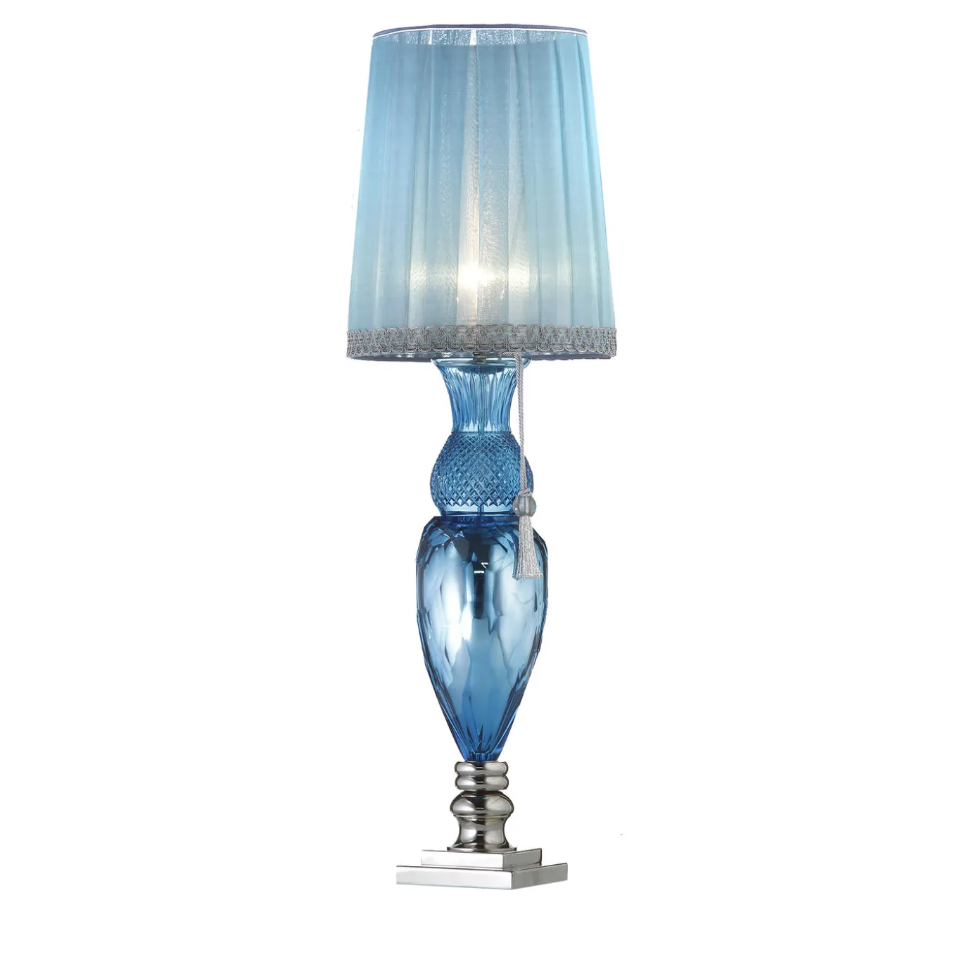 A vivid pop of color and a stunning silhouette, combined with the use of exquisite materials, make this table lamp a superb addition to a luxurious interior. Either on a nightstand, entryway console or desk in the study, this piece will make a statement. Its structure is in hand-cut Florentine 24 lead crystal with a mirrored finish. The faceted surface on the sinuous bottom and boasts two different textures in the top elements, complementing the texture of the lampshade in double-layered organza. Crystal is also available in pink, amber, purple or transparent finish, please ask the Concierge.