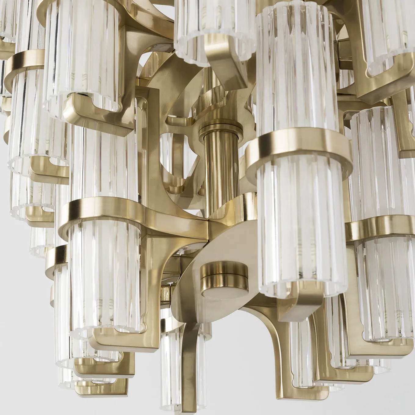 Oval chandelier featuring a satin and polished light gold finish with transparent and satin clear crystal shades. Equipped with inner satin glass diffusers for balanced illumination. Suspended by a 100 cm steel wire, this medium-sized piece blends contemporary form with refined detailing. Designed by Emanuela Benedetti, it offers an elegant statement for sophisticated interiors.