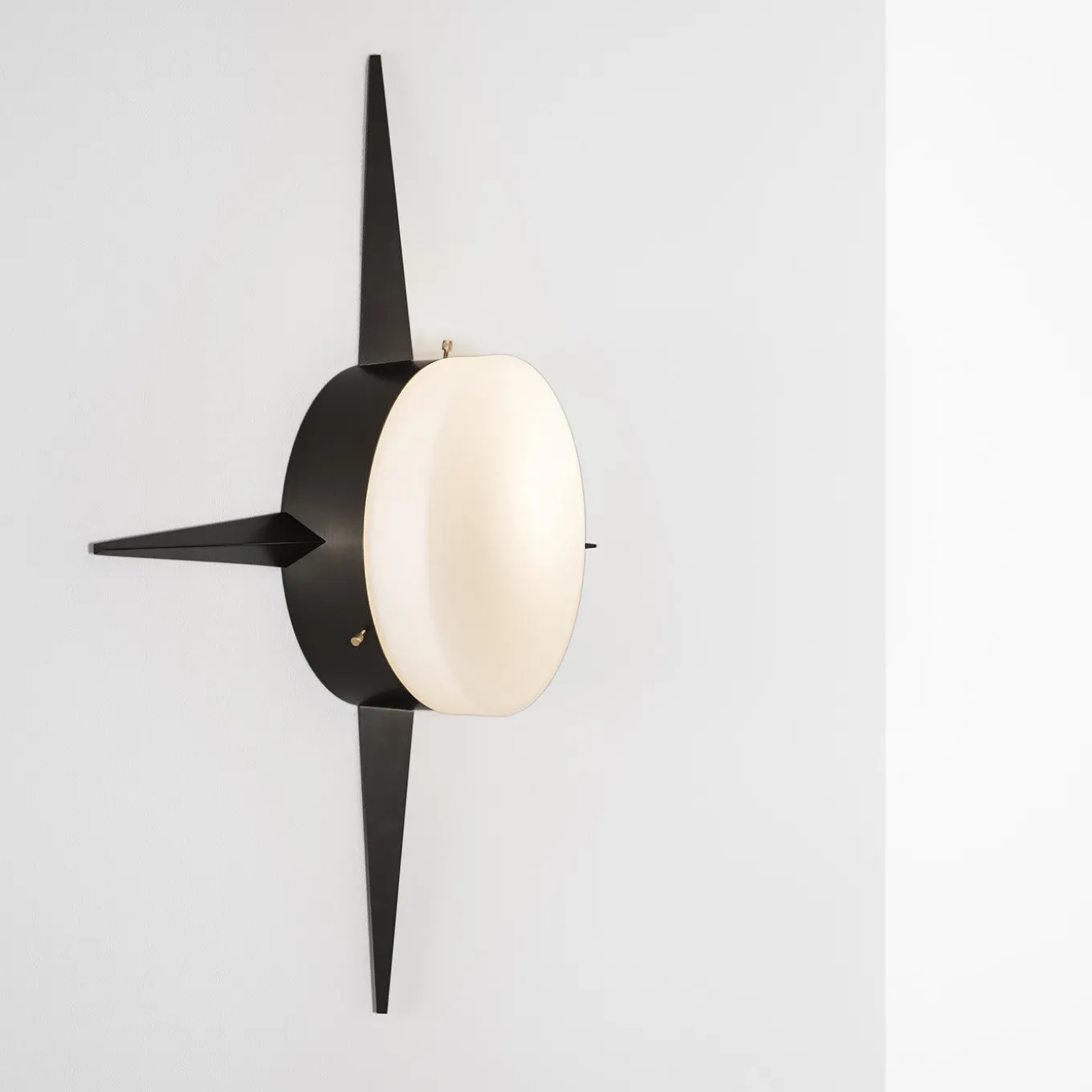 Simple yet highly decorative, this wall or ceiling lamp will infuse a warm ambience to any interior. Marked by four brass needles, it is reminiscent of a traditional compass. Enriched with a luminous opaline shade, this piece is compatible with incandescent and LED bulbs (not included). It can be wired for North America (110V 60 Hz – E26 socket bulbs) or Europe (220V 50Hz – E27 socket bulbs), and is available in other finishes.