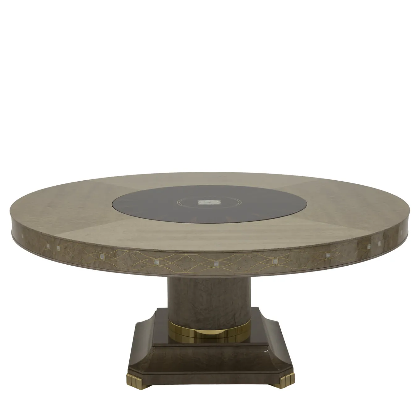 An impressive focal point in any dining room, this stately table is crafted with veneered maple “occhiolinato” (an exquisite pattern of glossy circular variegation that recalls the profile of a bird’s eye) and natural macassar ebony in a glossy finish. The round top has a wide border with a decorative inlay in gold and mother-of-pearl and a swivel center in darker finish. The pedestal base features a column raised on a tiered square foot, accented with gold-plated metal corners. The top and lazy susan measure 180 cm and 80 cm respectively. A classic look that will complement any decor.