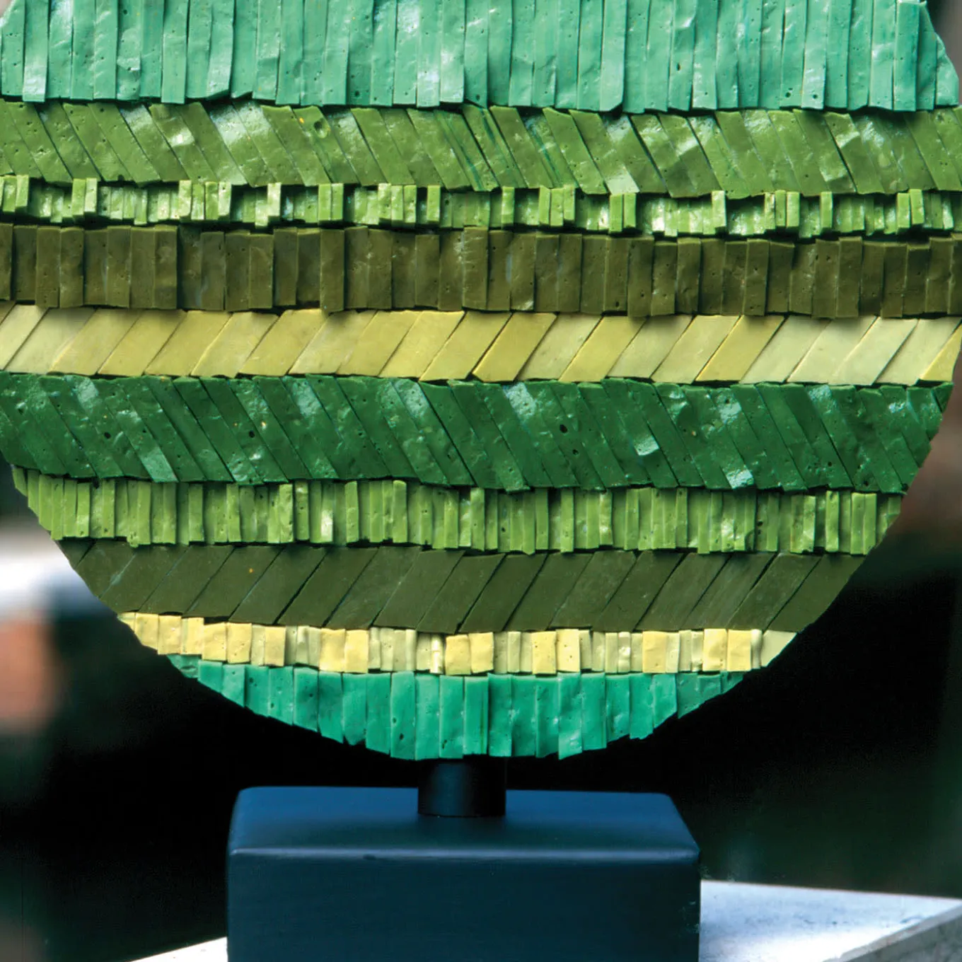 Gianmaria Potenza’s use of the mosaic is linked to the Venetian tradition and it evokes the lights and colours of the Venetian Lagoon, playing on the water effects, as if it were a constant dialogue between art and water. Potenza’s revolutionary characteristic is to insert the mosaic tiles not only long ways and flat but crossways and projecting outwards. It is a rotating vitreous enamel mosaic sculpture with a 40 cm diameter exhibited at Villa Finaly and at the Museum of Sant’Agostino.