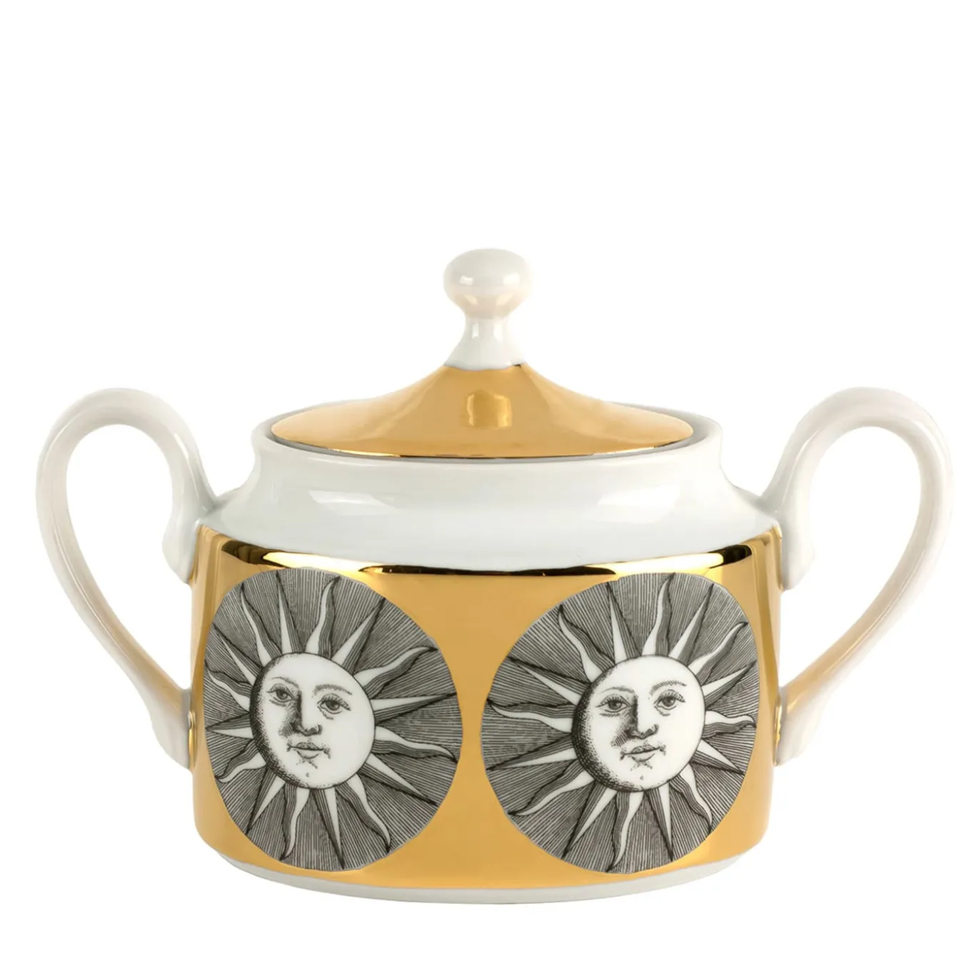 The sun decoration graces this hand-decorated porcelain sugar bowl with gold accents, transferring Fornasetti’s imagery to an object for daily use and thereby transforming it into a collector’s item. Any minor discrepancies between similar creations are the result of craftsmanship and attest to the uniqueness of each product.