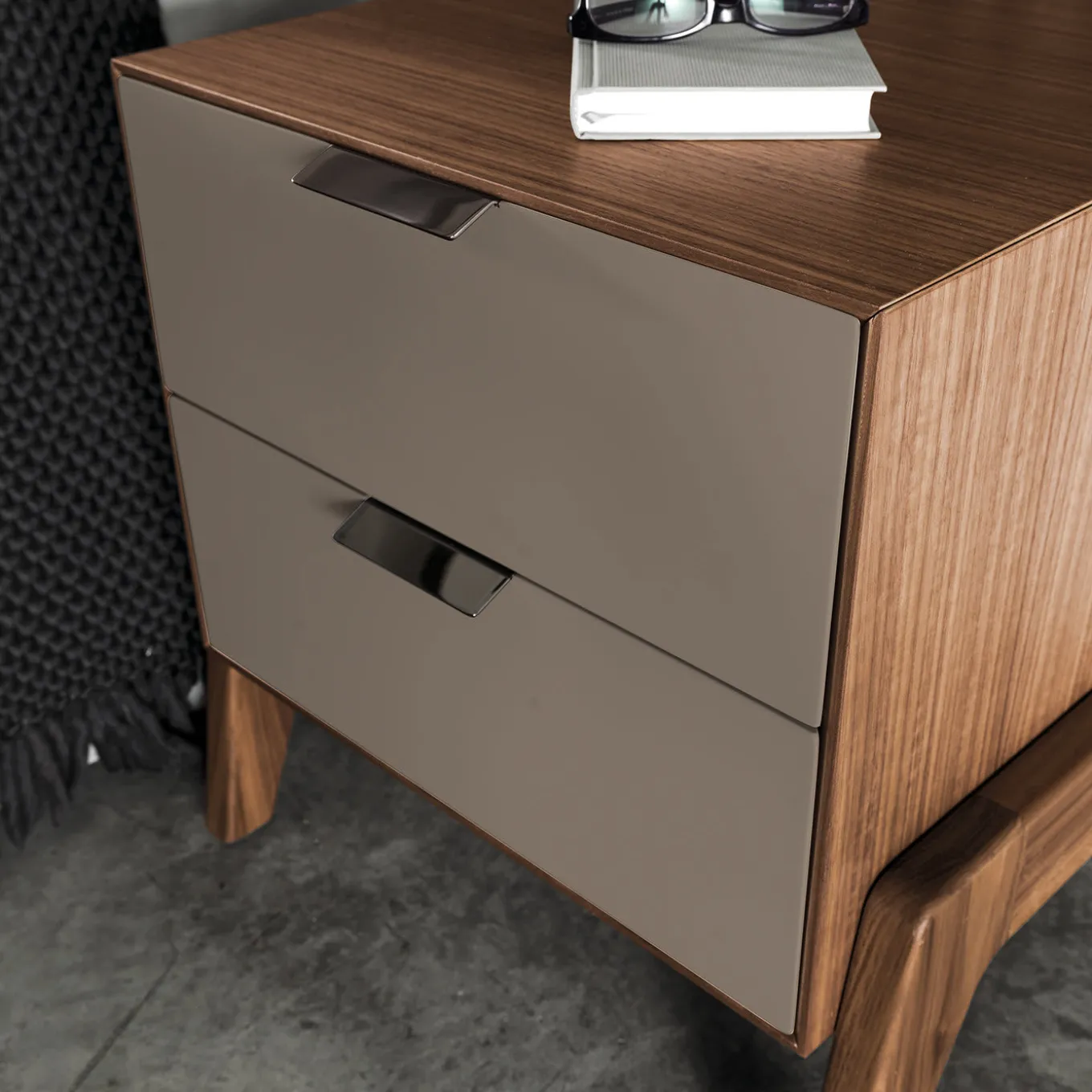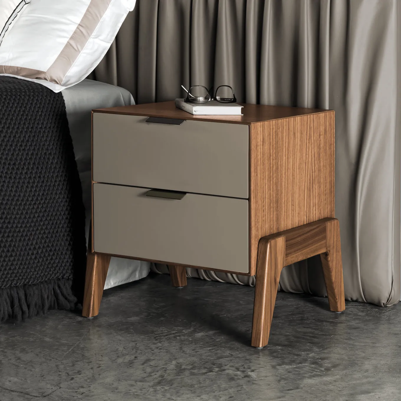 Offered in a variety of customizable finishes, this modern and elegant nightstand is part of the Solferino Collection characterized by angled legs unconventionally mounted outside the structure that infuse a distinctive character. Enclosed in a Canaletto walnut wood frame, the two drawers have matt greige-lacquered front panels and chromed metal handles and feature a white open-pore ash veneered interior.