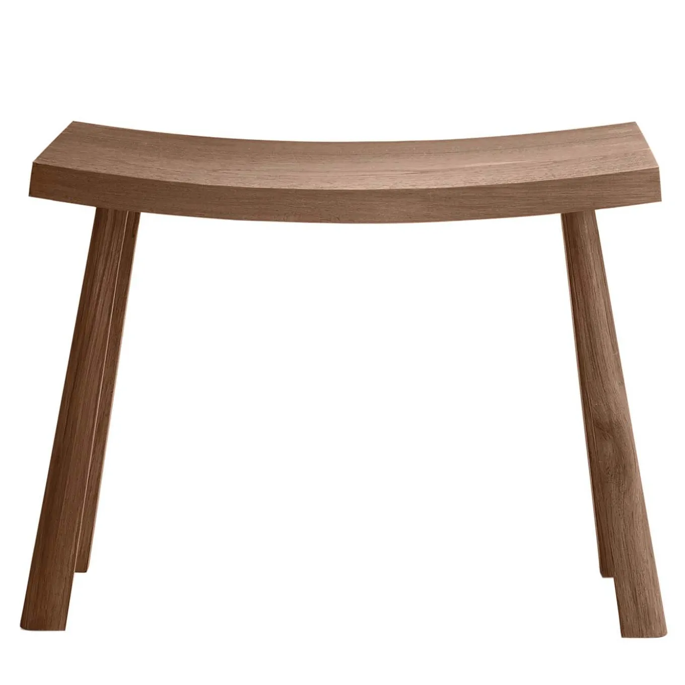 This bench features a concave seat and is suitable for indoor use. It is made from solid canaletto walnut. It is also available in solid dark ash. For the outdoor version, it is available in Iroko wood. Please contact the Concierge for more information.