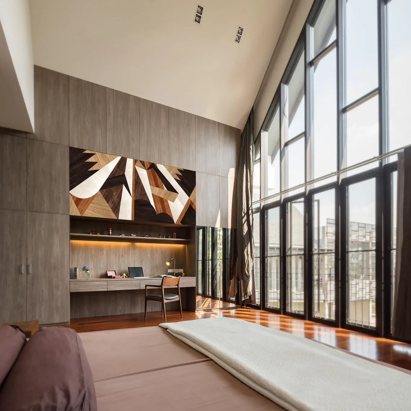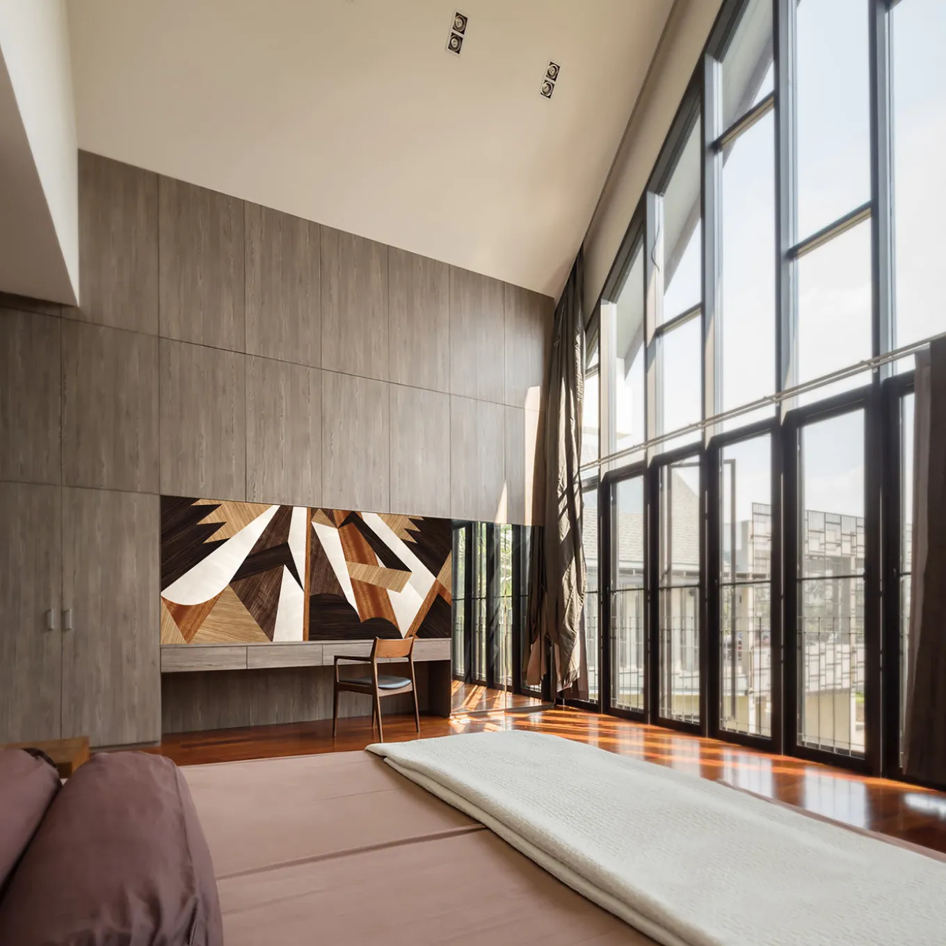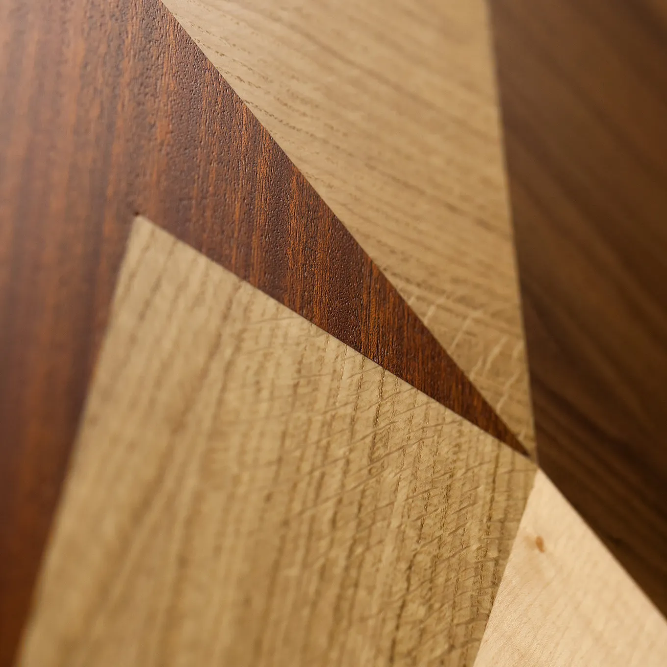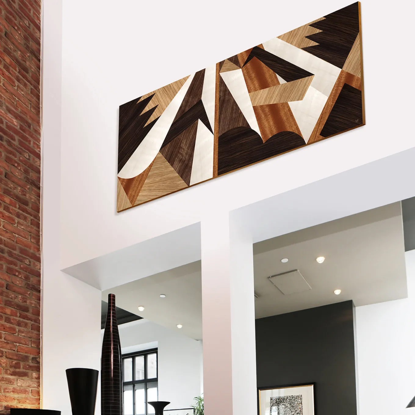 A geometry of harmonious lines created by prized wood inlays makes this wooden panel’s abstract pattern that will blend effortlessly into a modern interior. White maple, European oak, mahogany, European walnut and wengè woods are expertly carved and masterfully composed in a three-dimensional flux of angled shapes brimming with dynamic appeal. The name of this boiserie translates as “Above/Below” to symbolize a magic dimension where what is below and above interchange in an interplay of lights and shadows. Finishing: Mirror polished.