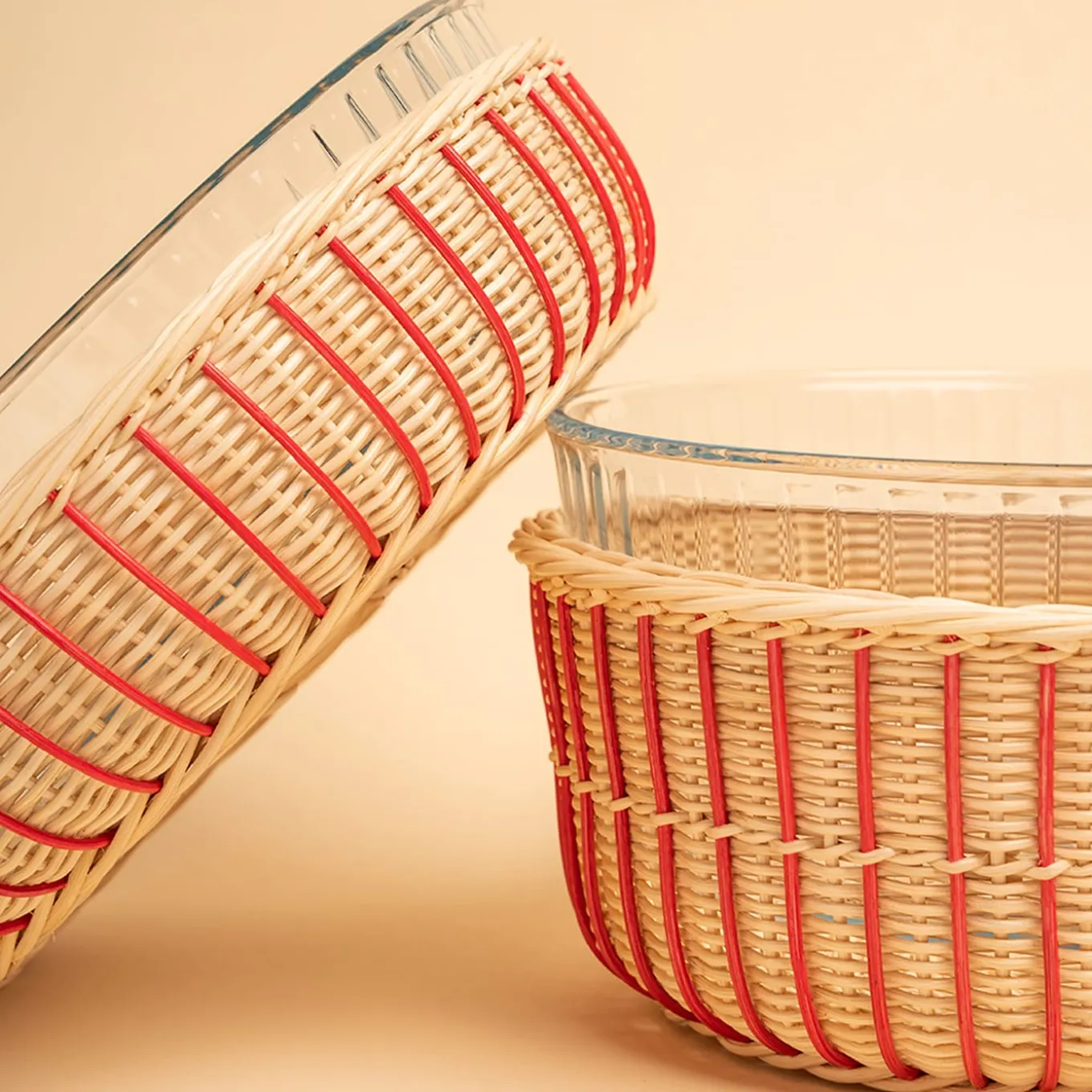 An elegant design that merges the polished flair of Pyrex glass with the textured character of wicker, this masterpiece will be a standout element in any interior decor. Crafted with an exquisite two-tone design, featuring natural and geranium pink hues, this plate is the result of a secret recipe. It utilizes plant dye extracted from the madder plant to achieve the vibrant pink pigment, renowned since ancient times for its dyeing properties. It beautifully marries function and style!