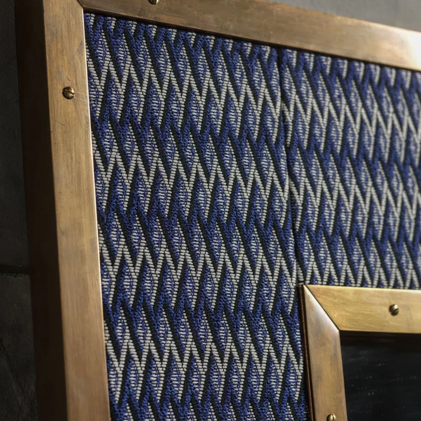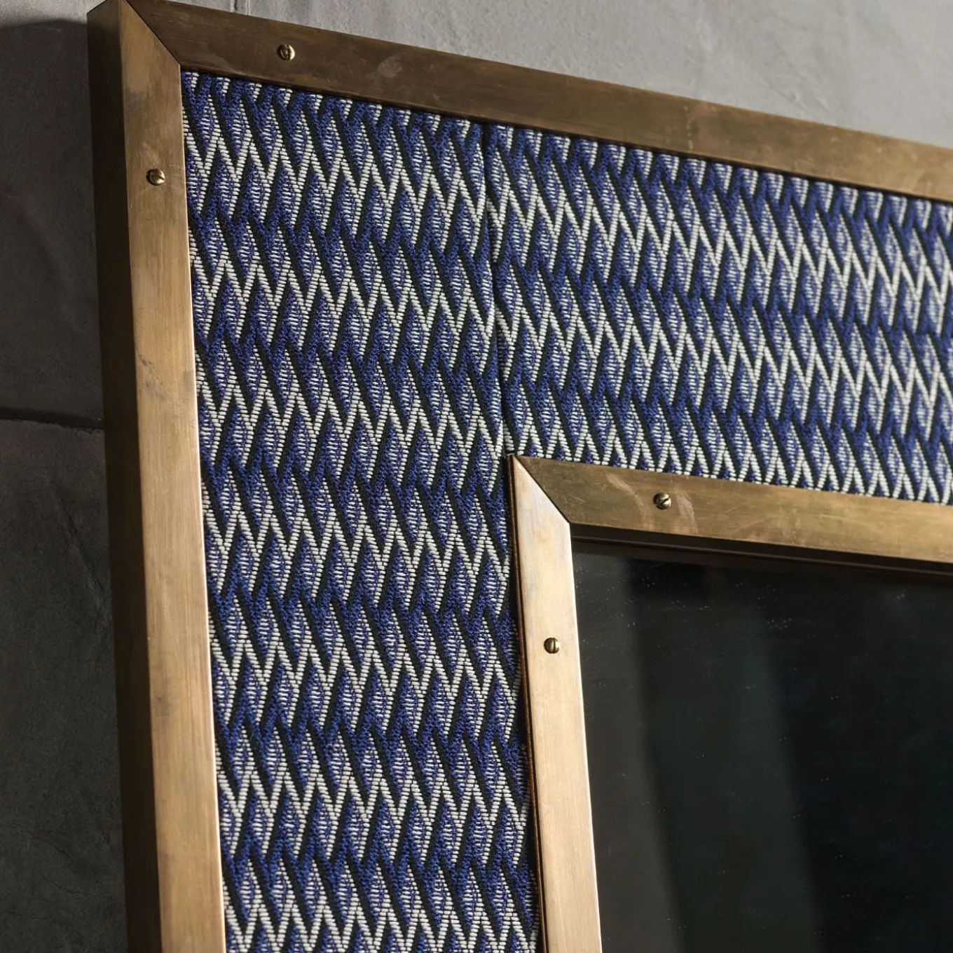 This stunning rectangular mirror is an exercise in elegant finishes and sartorial value. Outlined by bright natural-finished brass profiles, the frame flaunts a fine fabric upholstery that hypnotizes with its extensive zig-zagged pattern emerging from a yet reassuring blue-toned backdrop. The piece will make for a superb addition to vintage-inspired decors as well as modern ones.