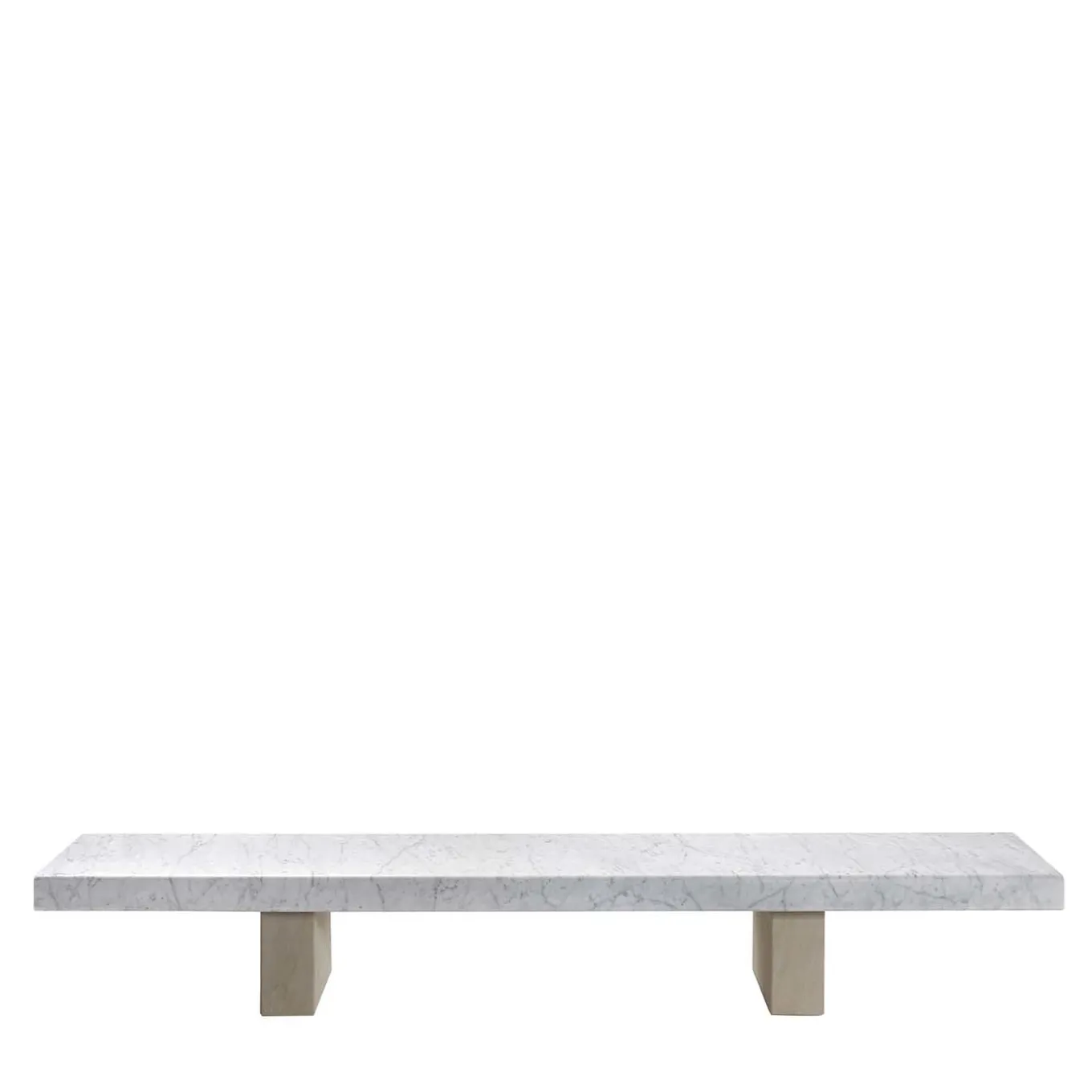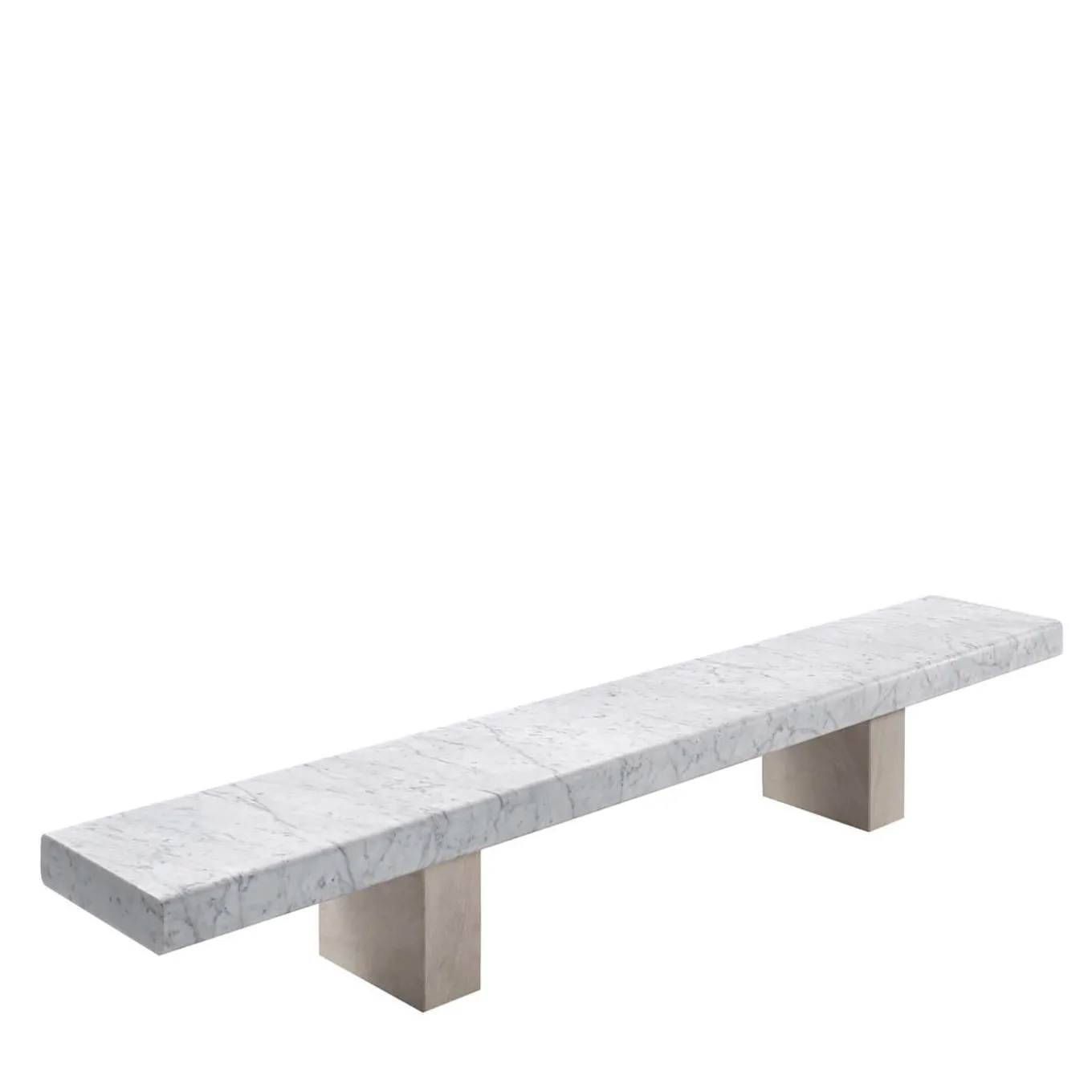 An impressive showcase of craftsmanship, this exceptional bench is crafted of white Carrara marble and Avana natural stone for a striking visual effect. Designed by John Pawson, the Span Outdoor is collection of simple and functional pieces characterized by bold proportions and combinations of horizontal and vertical elements. This bench features a long rectangular Carrara marble seat with two solid Avana legs that infuse a sense of solidity and balance. A true work of art, this piece is best showcased in a contemporary indoor and outdoor decor either as a seating or display surface.