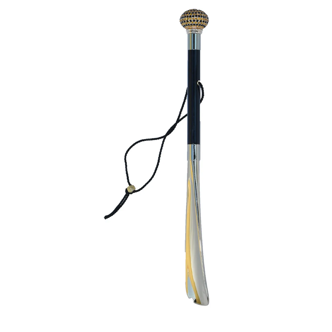 Adorned with precious Swarovski crystals, this elegantly handcrafted Black and Gold Sphere Shoehorn features a magnificently stylish brass handle. Both sophisticated and functional, it features a polished black shaft and a gold finish on the lower part in ABS. An exquisite accessory for a classy shoe collection.