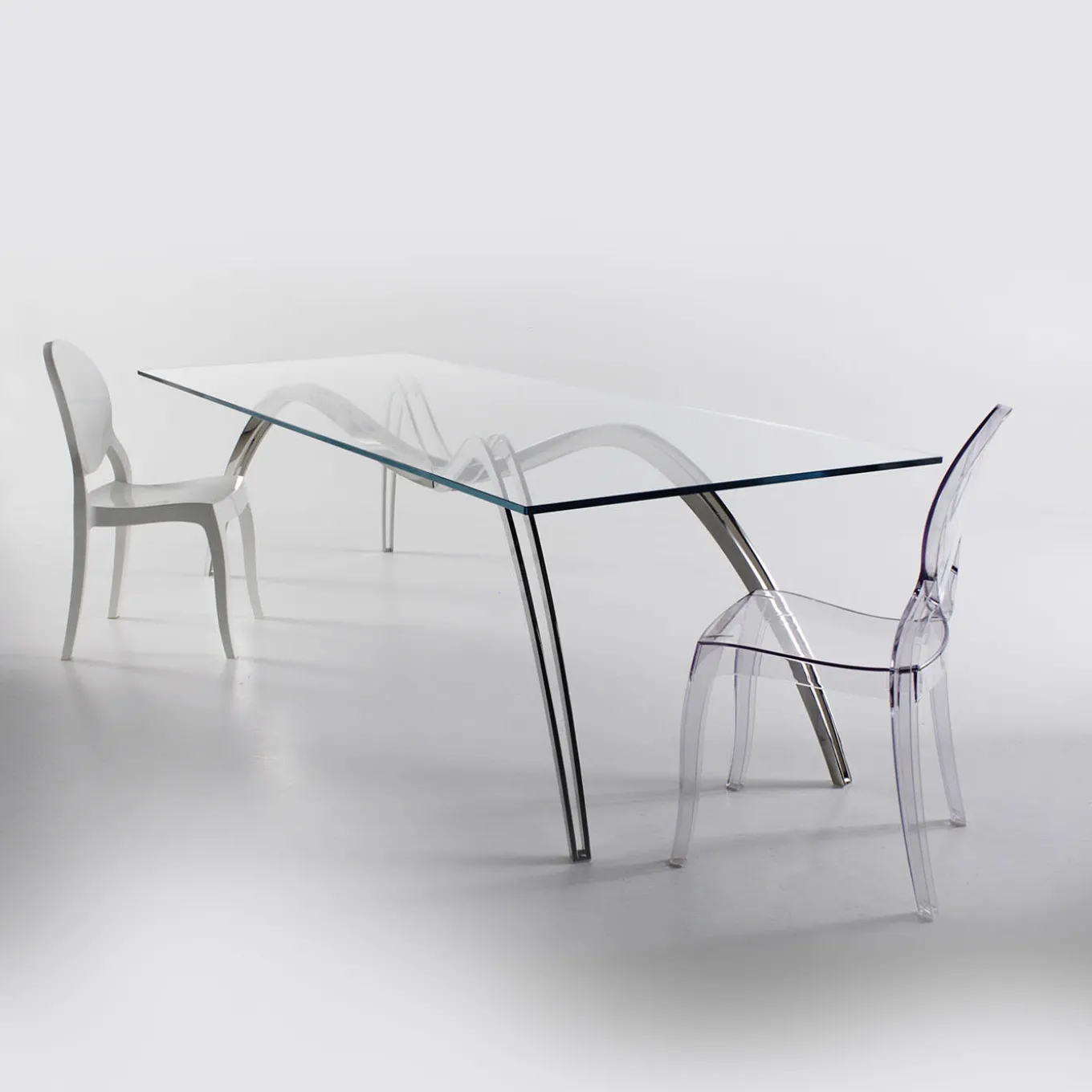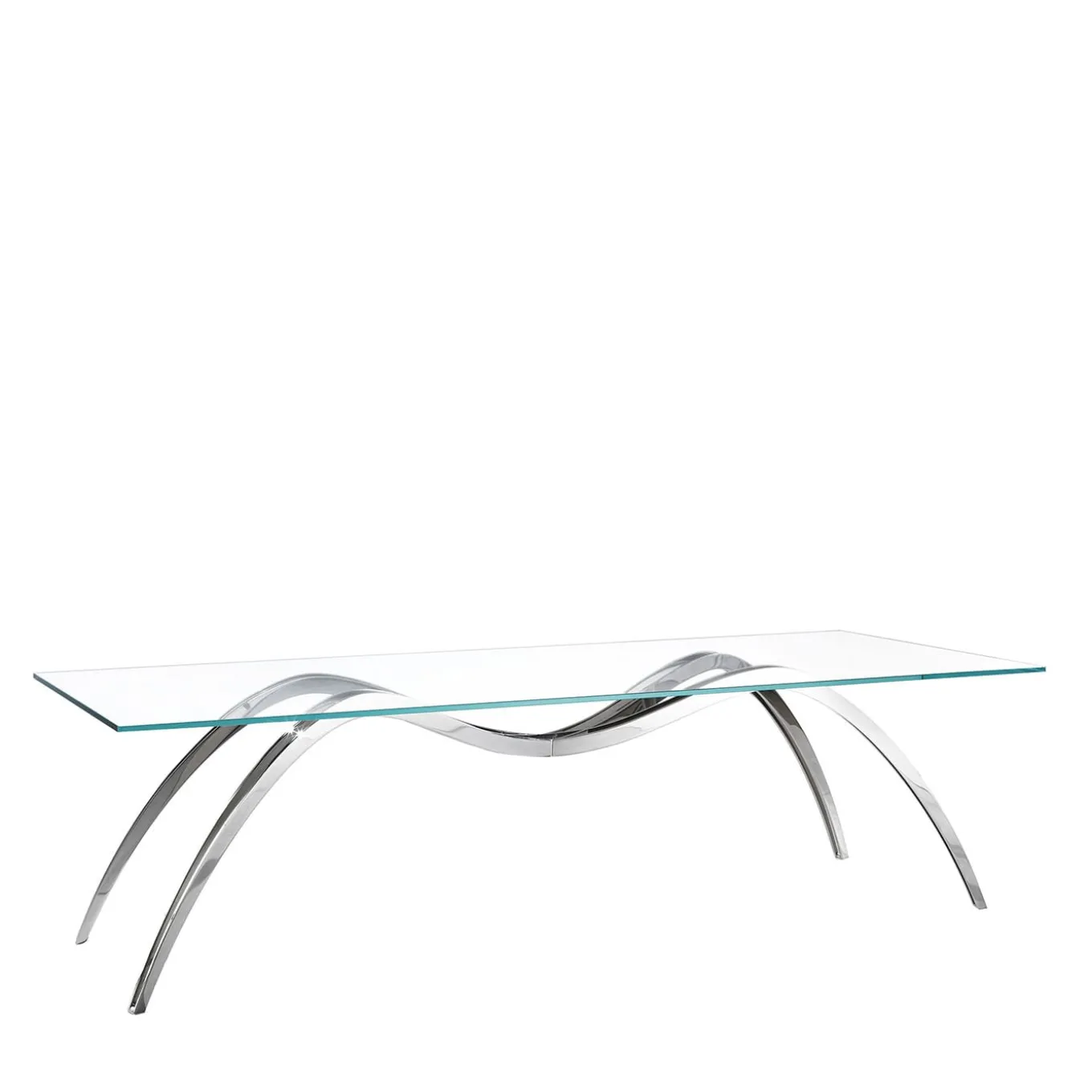 The Spider Skeleton dining table is made of mirror-polished stainless steel, and the tabletop is in extra-clear crystal glass. Limited Edition of 15. Each table is hand-signed, numbered by the artists (engraved) and 100% handmade in Italy. The fascinating projection of the spider’s shadow gave inspiration for this table. Starting from a shadow, uncatchable and vanishing, to achieve the zoomorphic structure. The artworks by Barberini & Gunnell are regularly shown at international art fairs.
