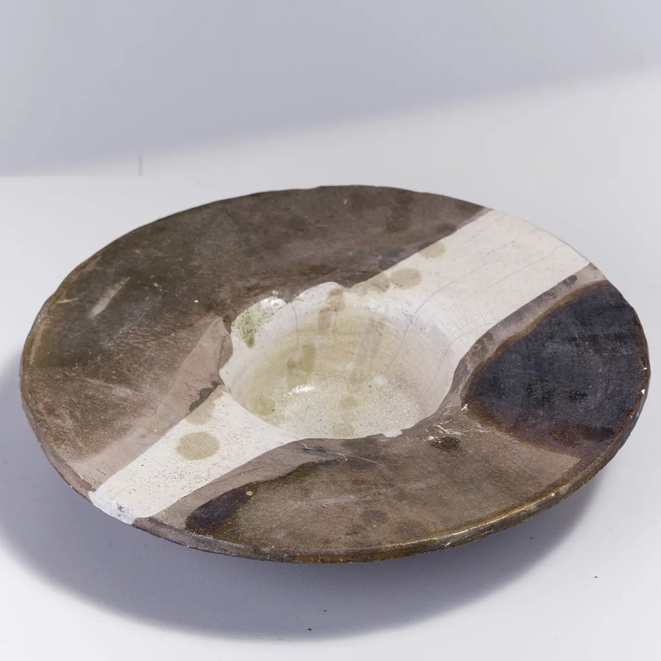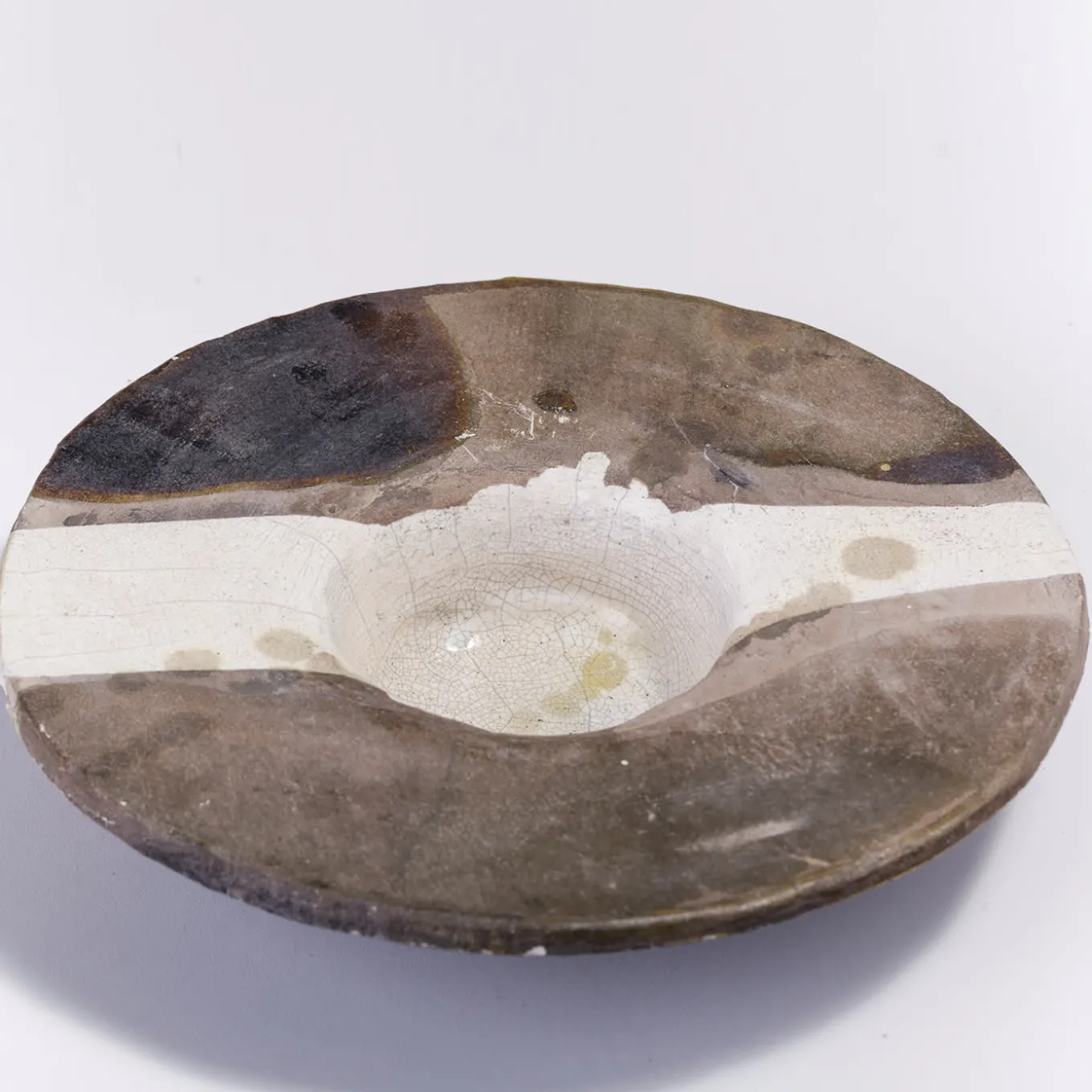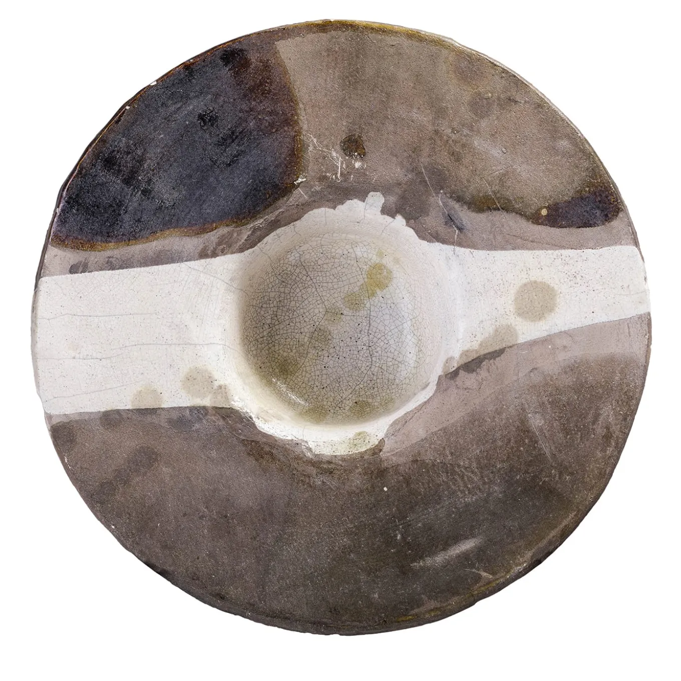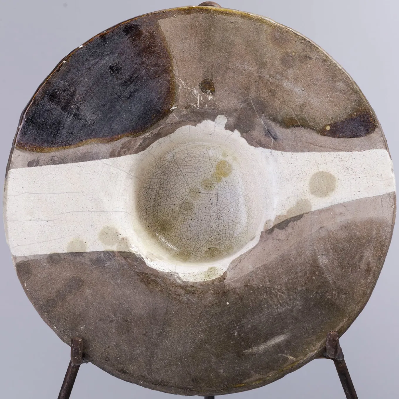 A one-off sculpture of extraordinary character, this design celebrates the naked raku ceramics technique, highlighted with the stupendous smokey shaded effect embellishing the light surface of this finely crafted object. Supported with an iron tripod, this disk-shaped sculpture will create an impressive focal point in any style of decor.