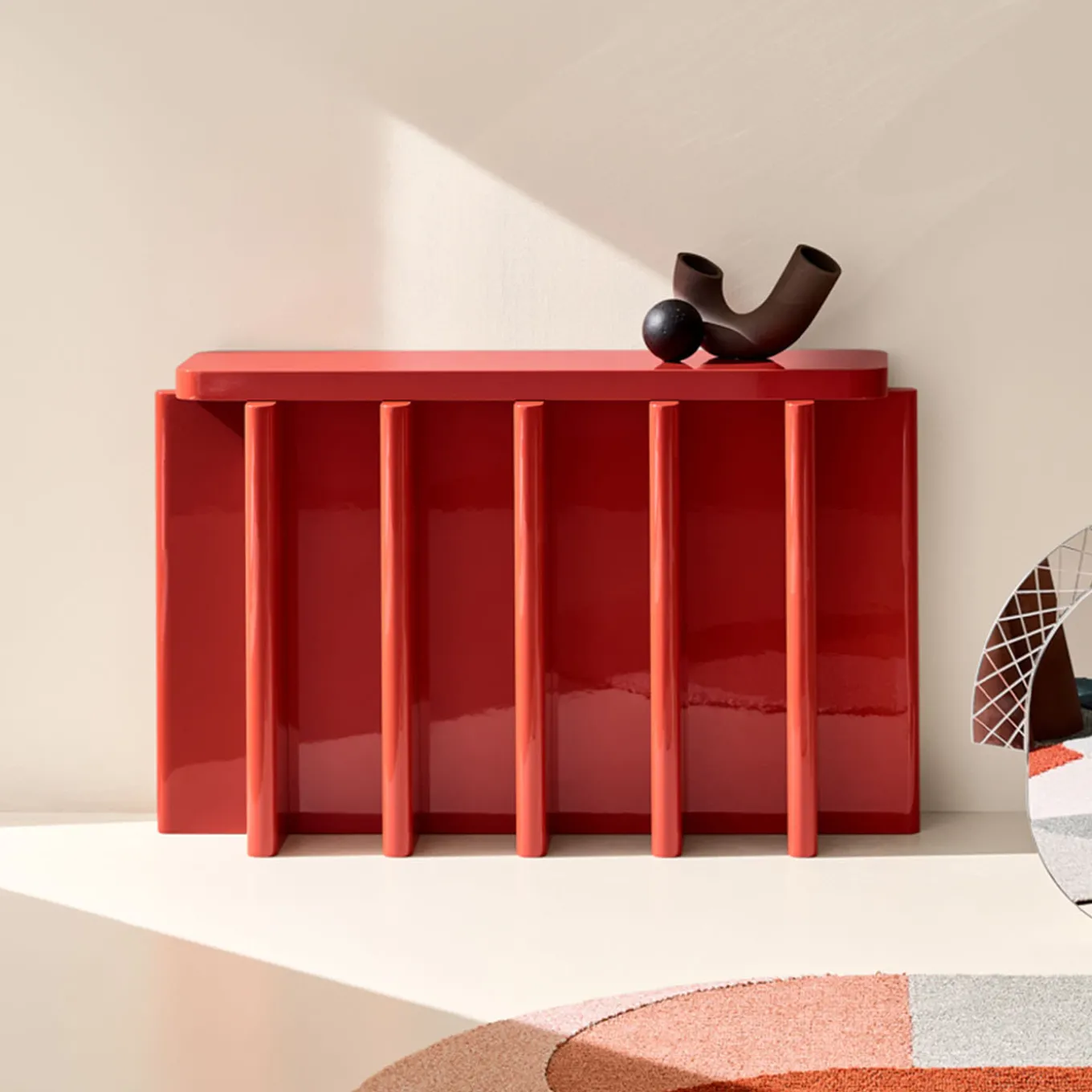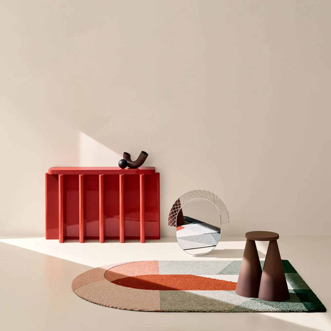 Essential and graphic, the table has a dense skeletal base made up of a repeated geometrical element that supports a smaller horizontal plane. The notion of stacked objects makes it a sort of altar with a totemic and primitive depiction. Design by Cara/Davide for Portego.