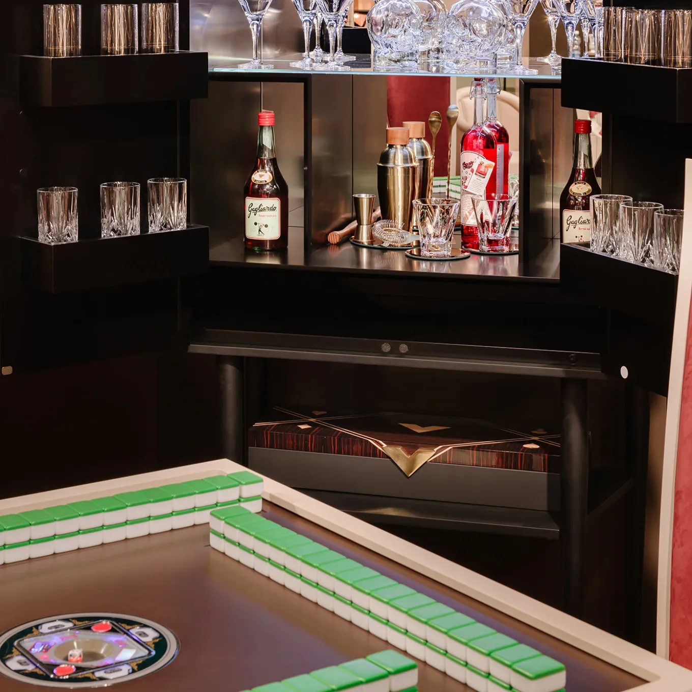 Featuring a geometric inlaid wood design accented with brass, the Spirit bar cabinet sets the tone in a sophisticated dining room or lounge area. The two cabinet fronts open to reveal black lacquered wood, glass shelves and a mirrored back, all illuminated by an automatic system. Handles and details in glossy brass. Additional shelving is suspended from the cabinet fronts.