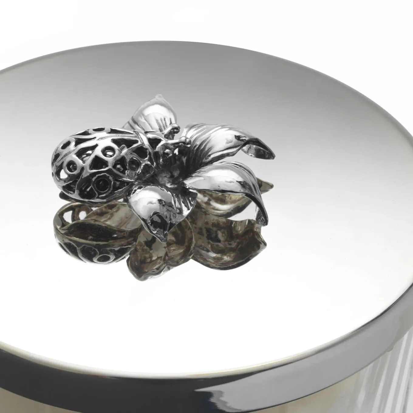 A splendid and refined piece of decor to illuminate one’s home, this candle vase will be a precious gift for a beloved one. Fashioned of glass, it boasts a unique silver-plated lid adorned with a flower and ladybug that functions as a sculptural finial that reveals the white candle inside when lifted.