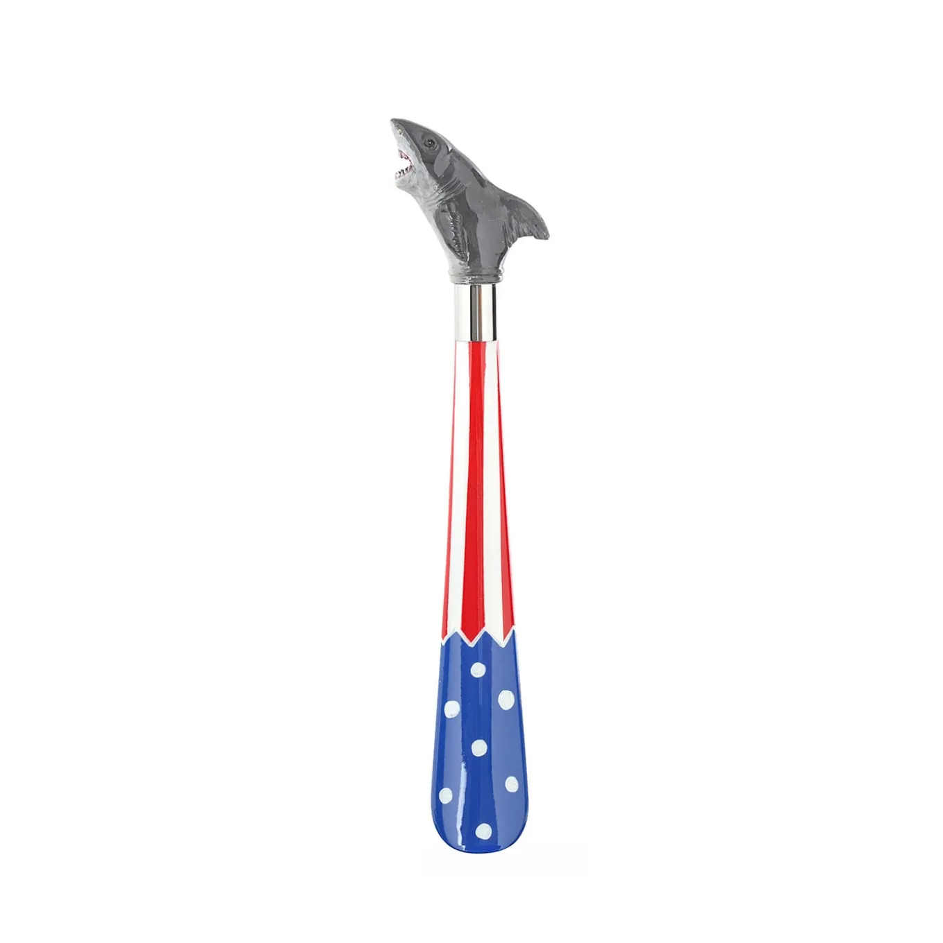 This artisan shoehorn stands out for its lively chromatic character. Both minutely hand-decorated and detailed, the shark head-shaped handle in marble powder is connected to the red-white-and-blue inspired ABS paddle by way of a brass ring with a silver finish. Please check the Artemest catalog for variants.