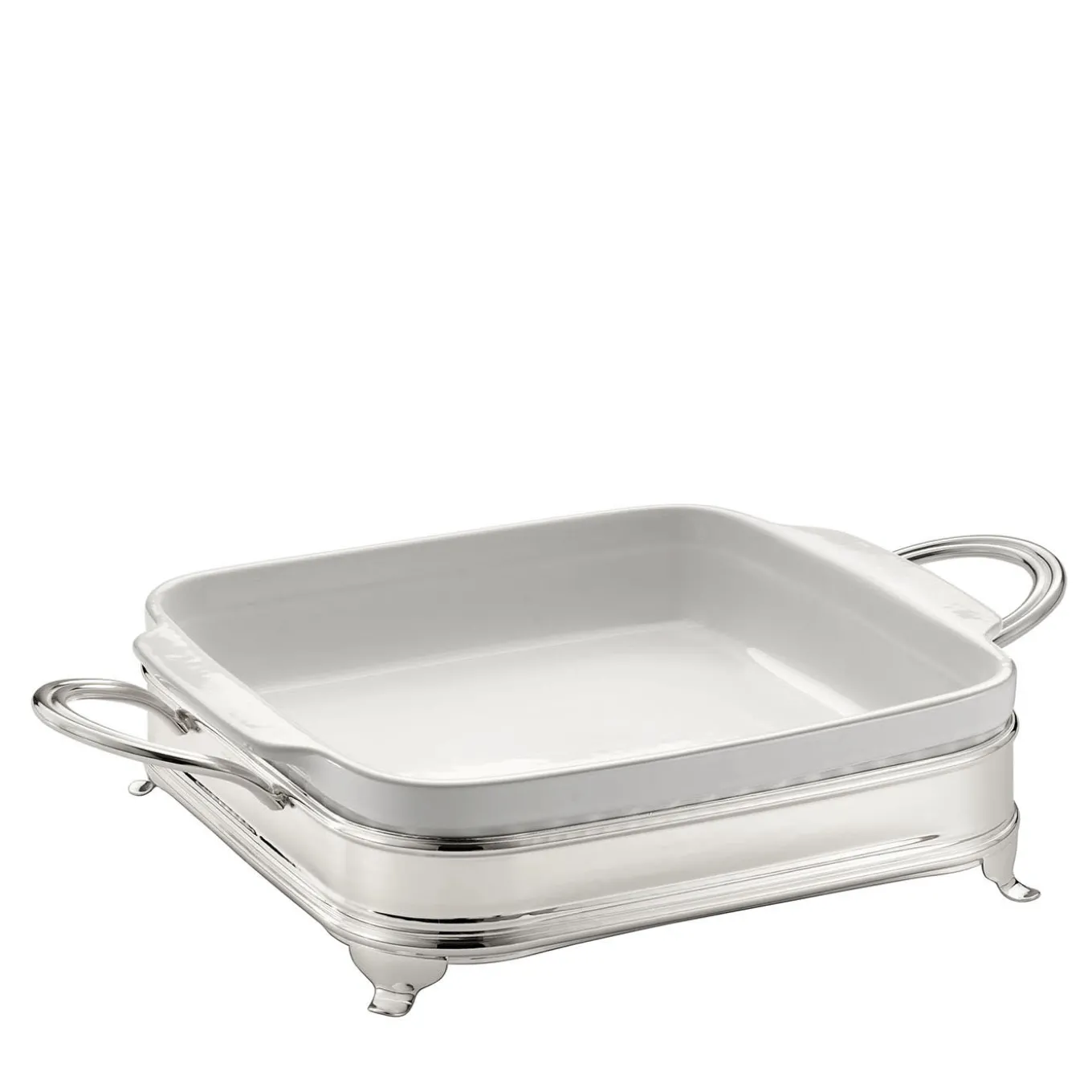 Perfect for elegantly serving food just taken out of the oven and avoiding direct contact with the table, a precious square ceramic baking dish is here offered together with a gleaming silver-plated holder. Equipped with a couple of practical handles and four tiny feet, it is equally stunning in refined homes or hospitality contexts, alike.