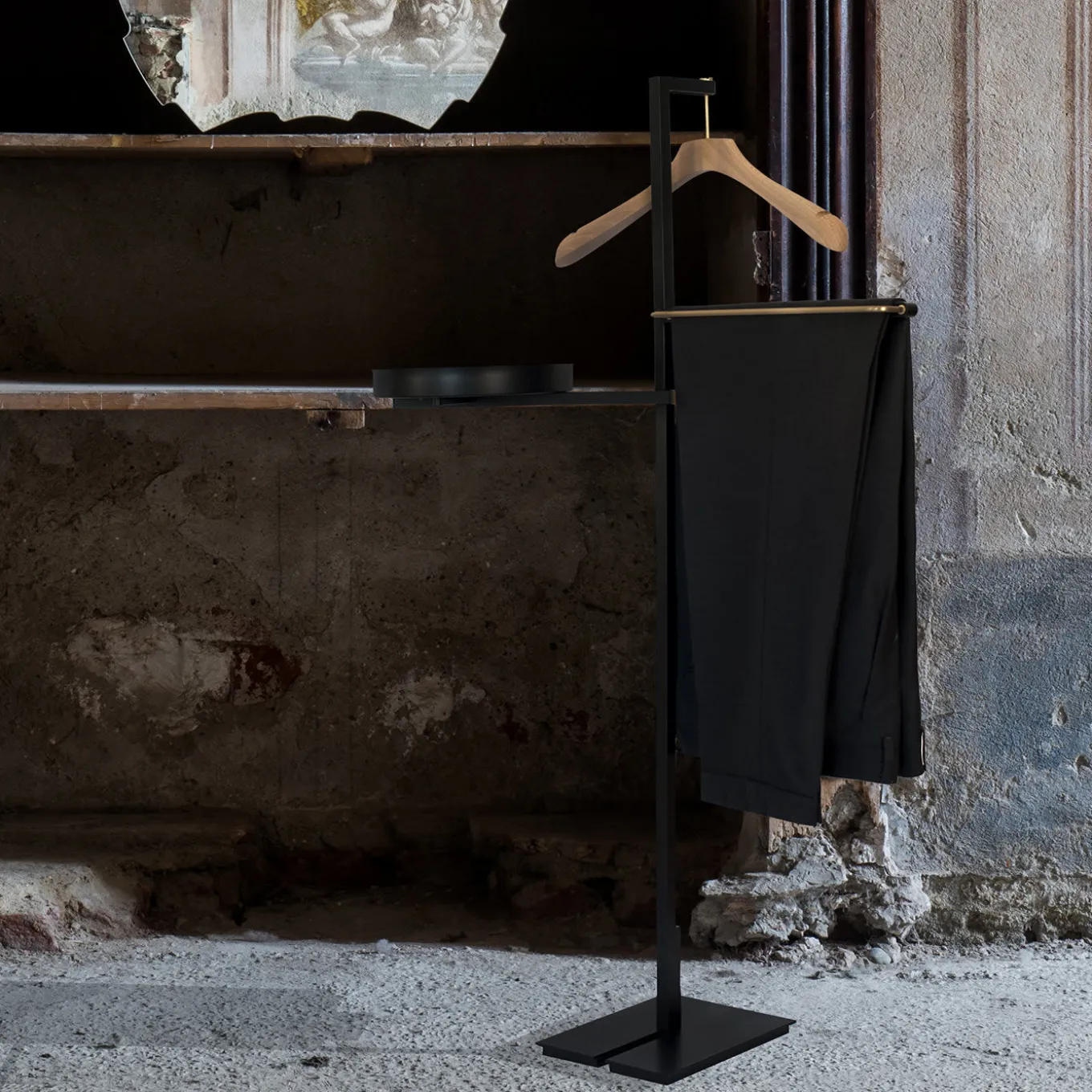 Pure functionality and formal sleekness define this precious valet stand whose frame features burnished screws. The streamlined frame, rising from a circular steel base, is fashioned of metal with profiles milled and varnished in opaque black with powder-based varnish. Showcasing a harmony of volumes reminding of antique scales, the design is equipped with a removable round vide poche (Ø 21 cm), a brass bar for trousers, and a hanger for shirts or jackets.