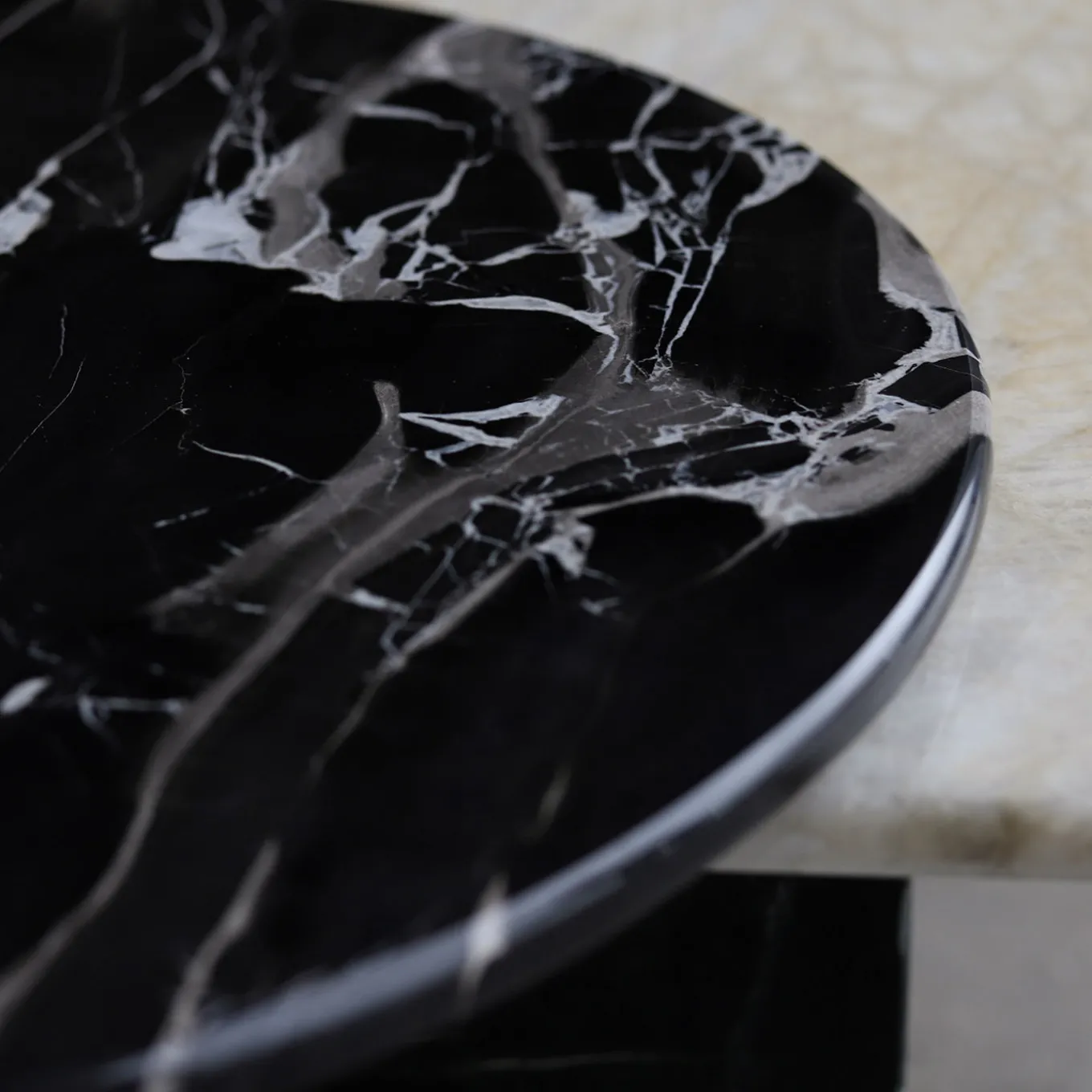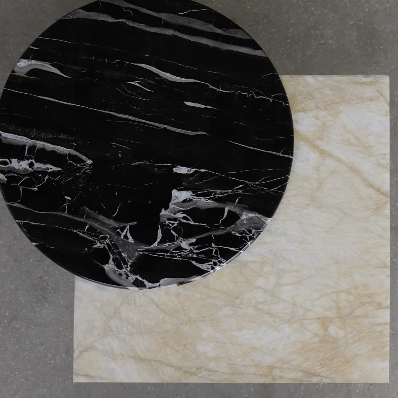 This sculptural marble side table features a bold composition of premium reclaimed stones. A luminous Quarzite Cristallo square top contrasts elegantly with a dramatic Portoro Silver round top, both supported by a solid Verde Guatemala marble base. This collectible piece merges natural stone craftsmanship with contemporary design, celebrating the raw beauty and timeless sophistication of marble. An effortless touch of elegance and sophistication for any living environment.