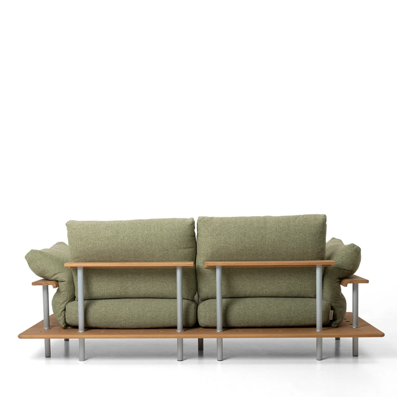 Stand Out sofa features modern lines and generous proportions supported by a wooden base that adds warmth and naturalness. The elevated structure creates visual lightness, while the perforated base design introduces dynamism and contrast with the solid frame. Wide, inviting cushions covered in Maestrale outdoor fabric provide comfort and encourage relaxation. Outdoor padding is included.