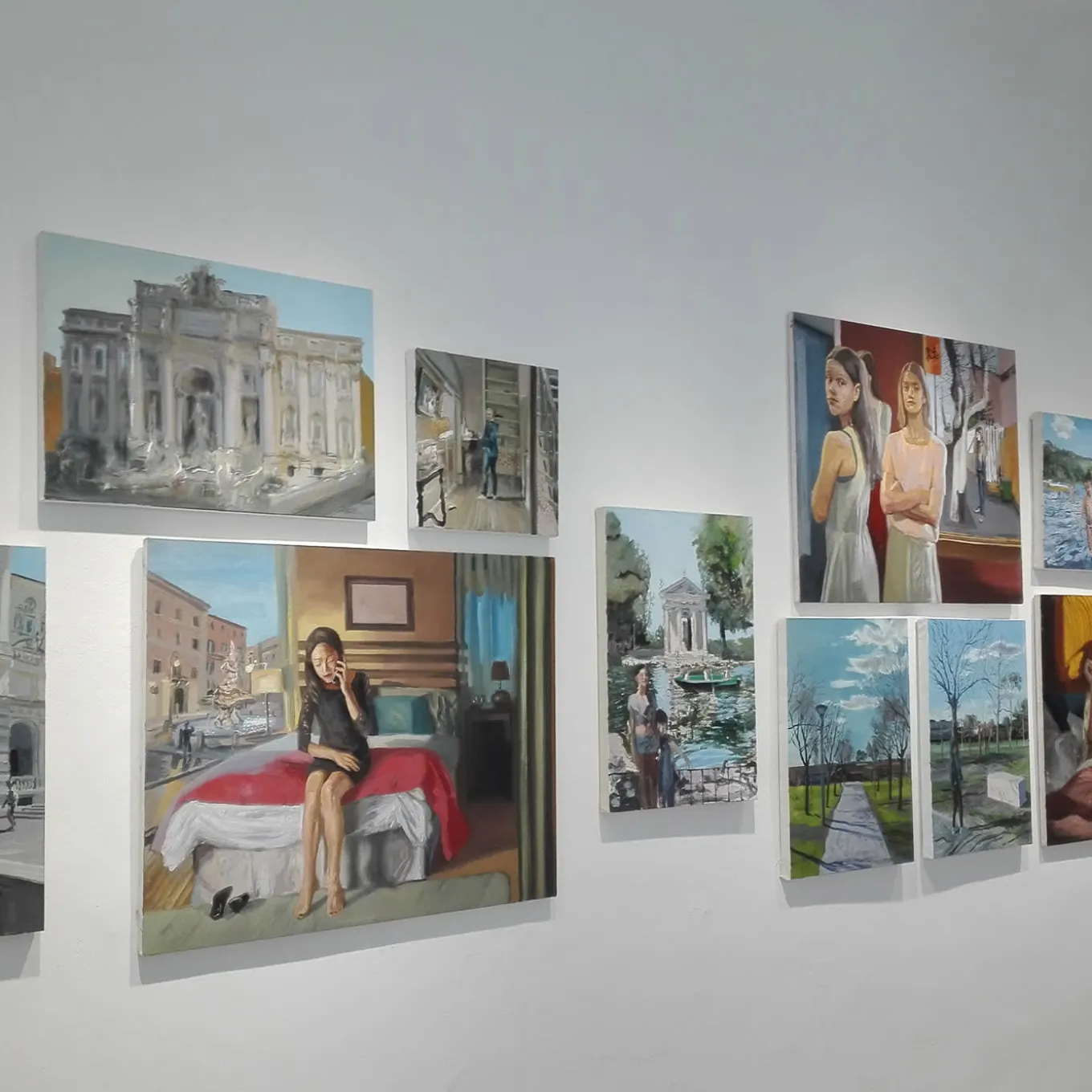 A hotel room in Rome, suggested by the view of a Roman square with a fountain in the background, defines this oil on cotton painting, where a woman wearing a black dress appears engrossed in a phone call. The bold brushstrokes and daring use of colors are a peculiar characteristic of Federico Lombardo’s style, which lends every element the attention it deserves. The painting is mounted on wooden frame support.