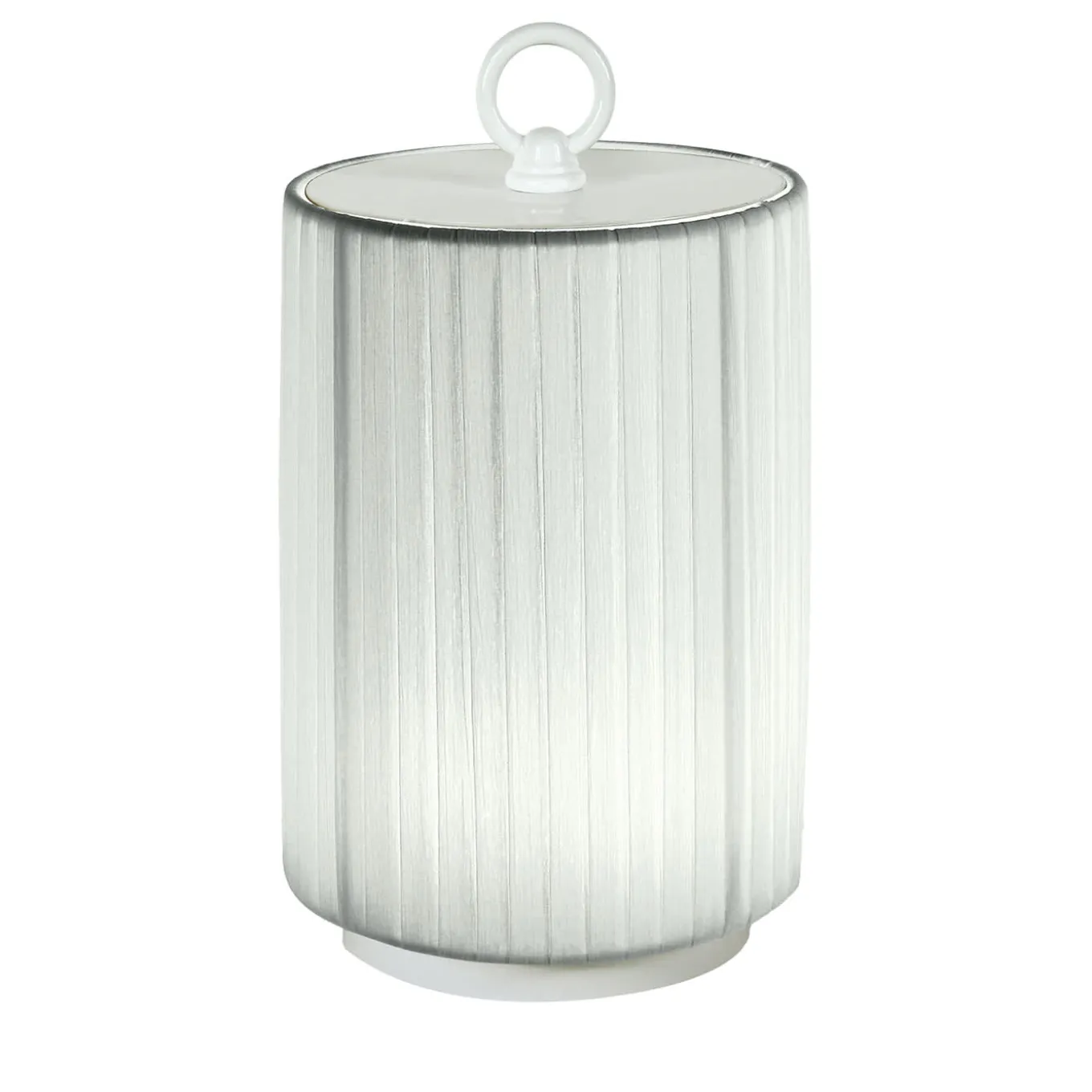 This bright and exquisite table lamp provides illumination wherever desired thanks to its rechargeable design and a top ring for easy replacement. Fitted to a metal frame finished in white, a cylindrical white fabric shade with a pleated texture filters the light that radiates from the three 1.2W LED sources encased within for a homogeneous and cozy light casting. Supplied with a power battery charger (95-240V) and an international plug adaptor kit, it has an autonomy of nine hours.