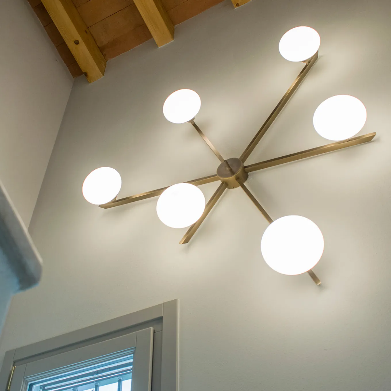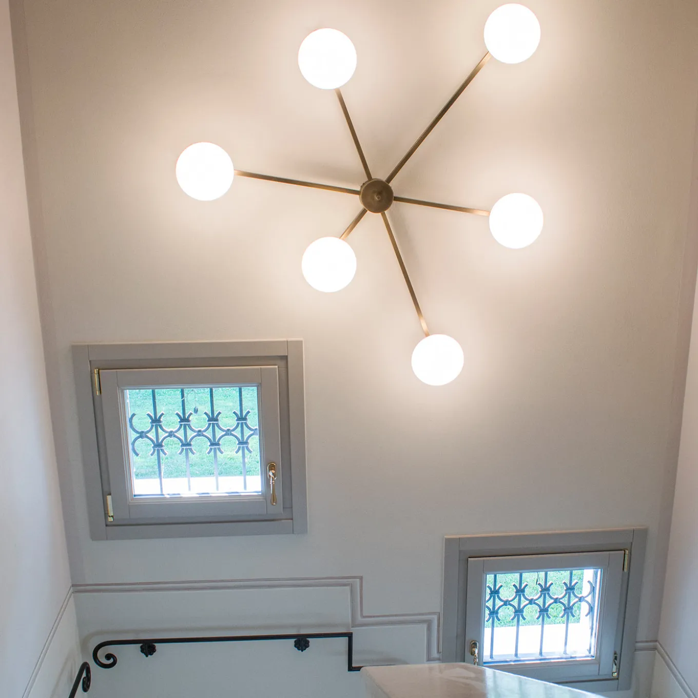 The Stella ceiling lamp by Luca Bussacchini features a central matte bronze metal body with six asymmetrically radiating arms. Each arm ends with a spherical satin glass shade housing a light point. The composition creates a star-like, constellation-inspired form that adds a striking visual element to contemporary interiors. suitable for medium to large spaces looking for a modern architectural light fixture. Bulbs are not included.