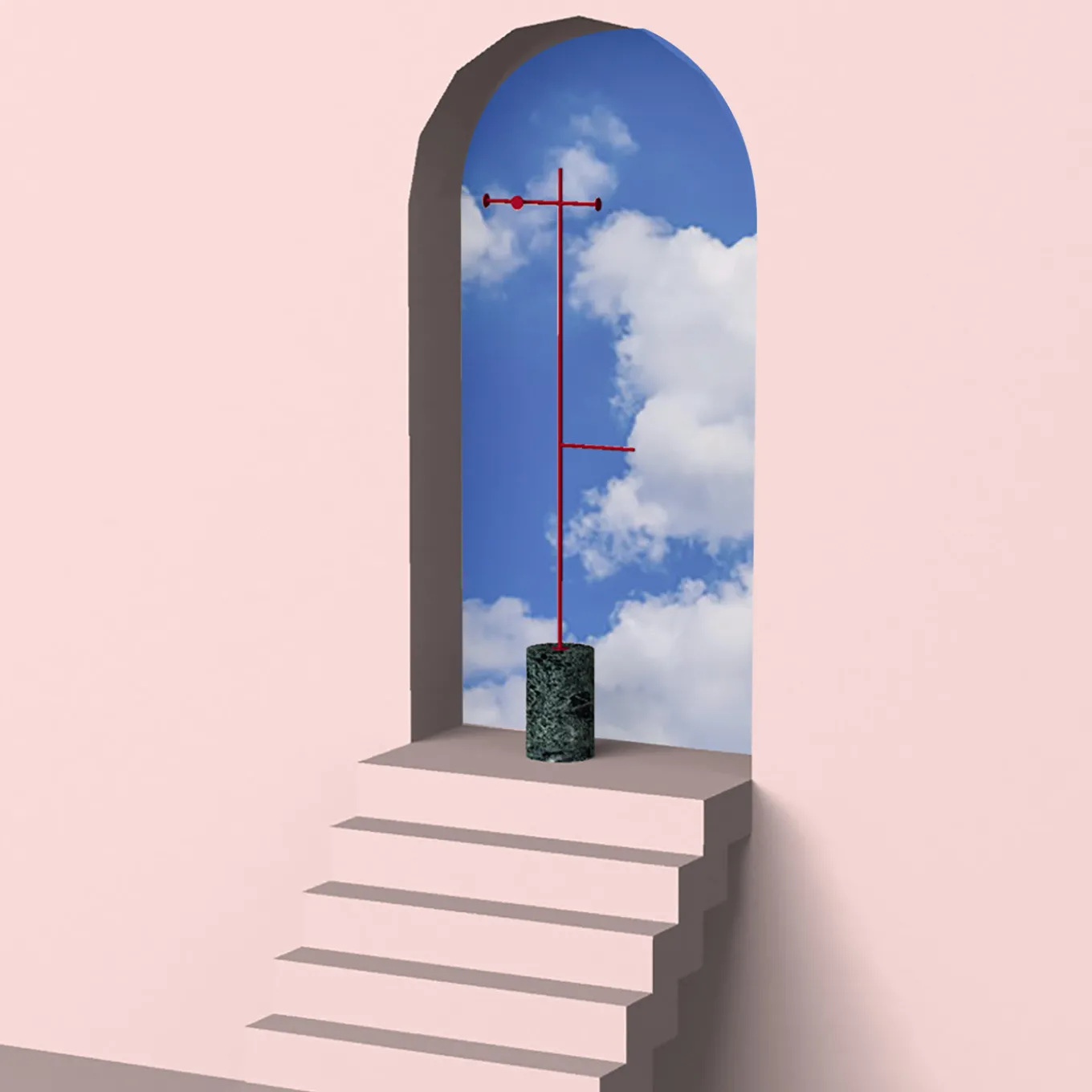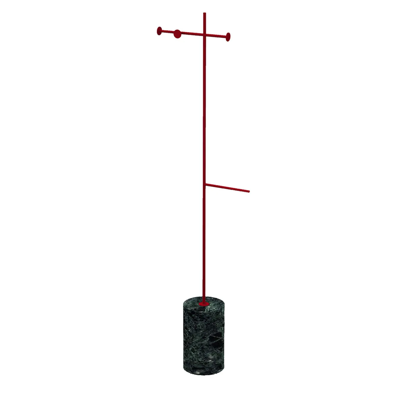 Part of an exceptional series of iconic, innovative designs named after the Italian word for “Stem”, this coat hanger boasts a functional and stunning character that will enhance any entryway, bathroom, or bedroom of contemporary sophistication. Mounted on a cylindrical base in Green Guatemala marble, it features a sleek and thin iron stem with two arms, entirely lacquered of ruby red. Available in other marble types and colors, please ask the Concierge for options and pricing.