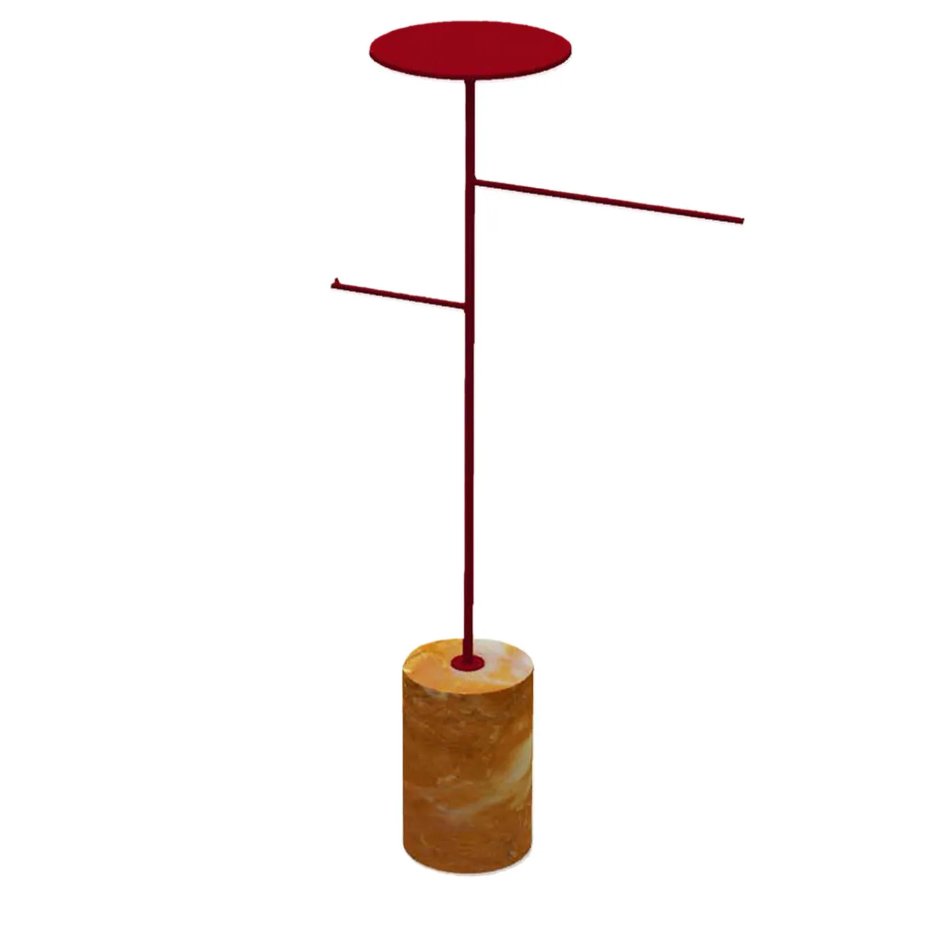 Bold tones enhance this gorgeous coat hanger and rack, sure to blend into lush and eclectic contemporary interiors. Resting on a cylindrical base in Yellow Siena marble, it features a ruby red-lacquered iron structure composed of a tall, vertical stem topped with a round tray and two horizontal arms. Customizable in a stunning variety of prized marbles and other lacquers, please ask the Concierge for details.