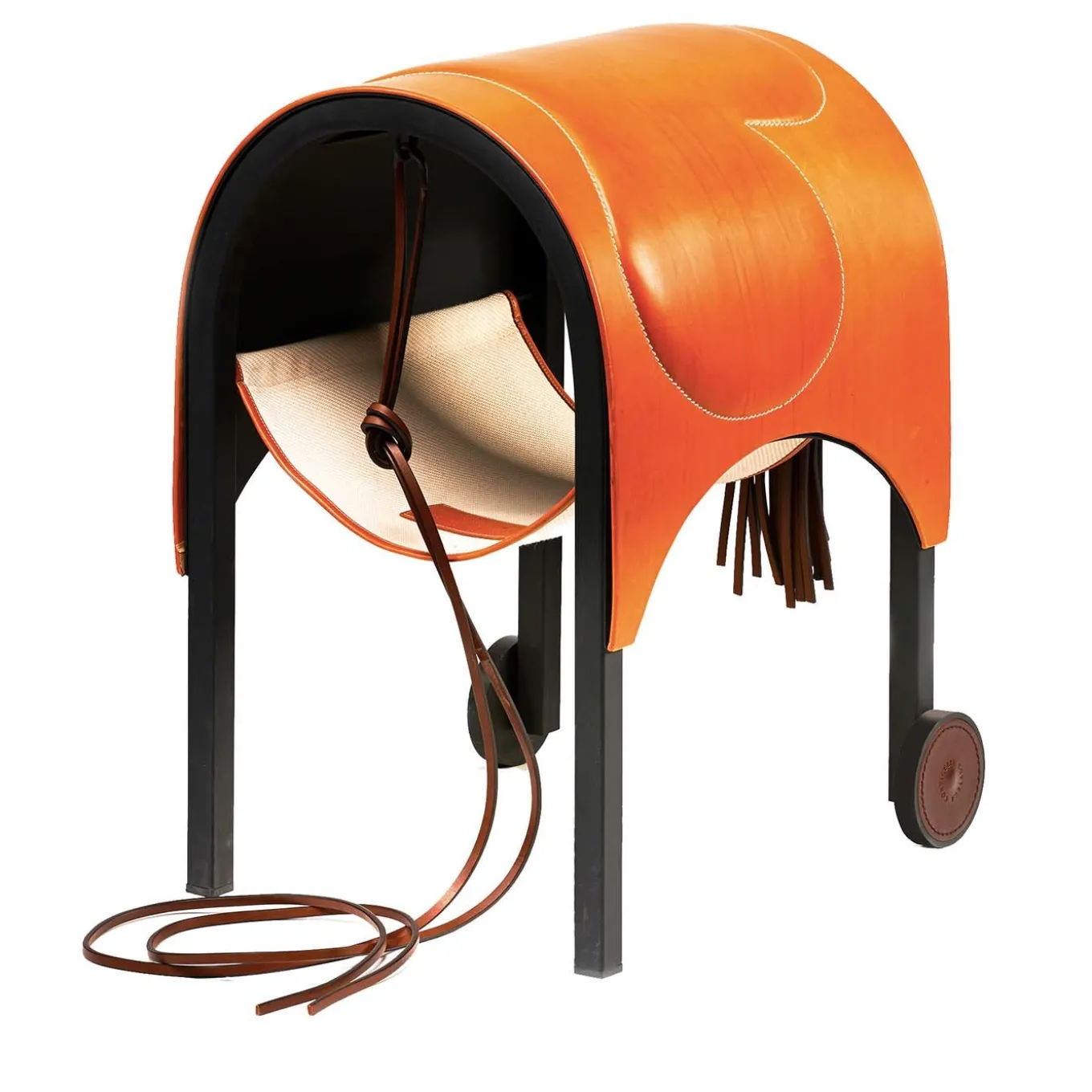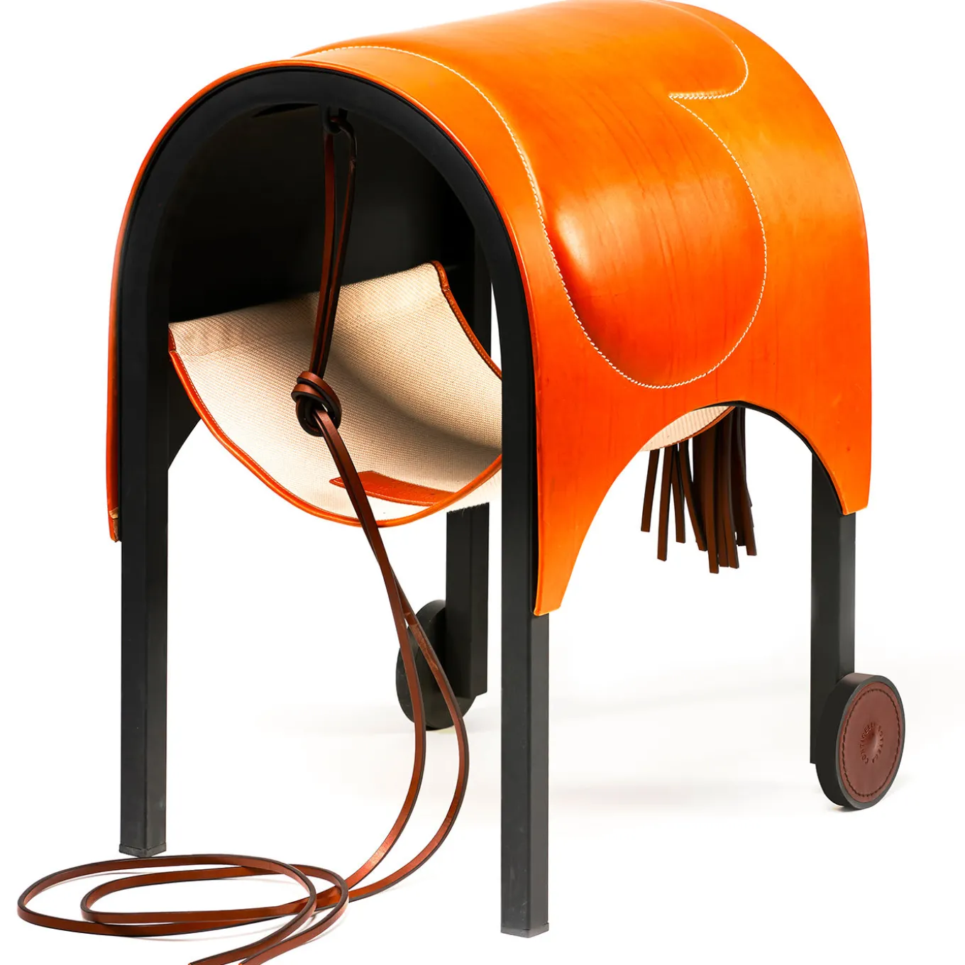 This unique, whimsical and minimalist stool in the shape of a saddle is inspired by the world of horses and equestrian sports. It features hand stitching, a one-of-a-kind fragrance, movable legs and playful, leather reigns and tail. A soft pocket allows for easy storage of various items. Its leather has been treated without the use of toxic substances.