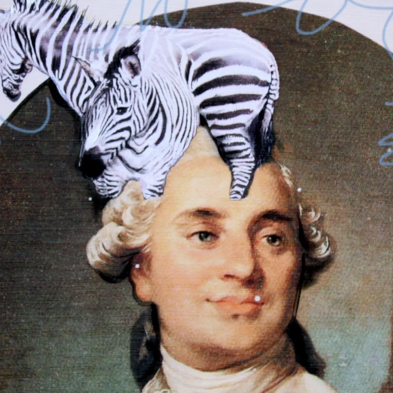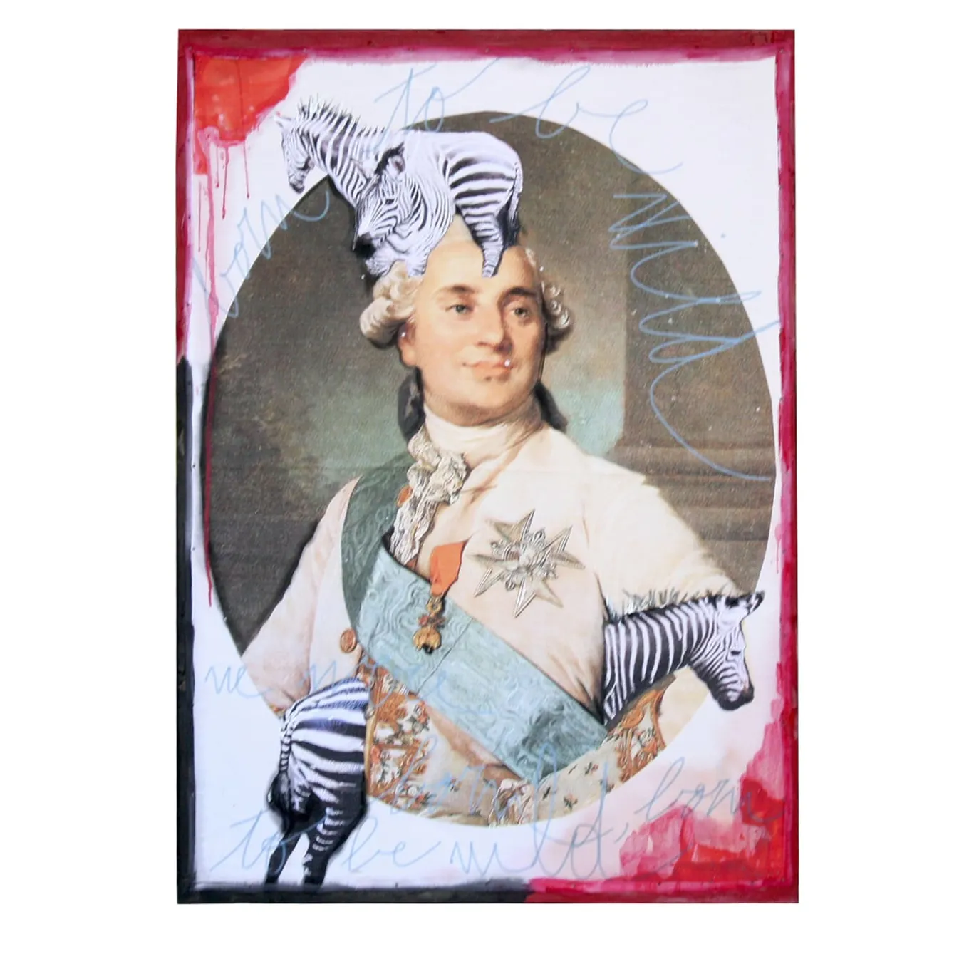 Embodying the perfect meeting point between scenography and interior design, this spectacular tapestry belongs to a limited edition of artworks by Barbara Petrecca. Printed on fabric and finished by hand with acrylic paint, it is fixed on a rough wooden frame and features an iconic, eclectic representation of Louis XVI. Any variations from the pictured item are due to its handcrafted nature.