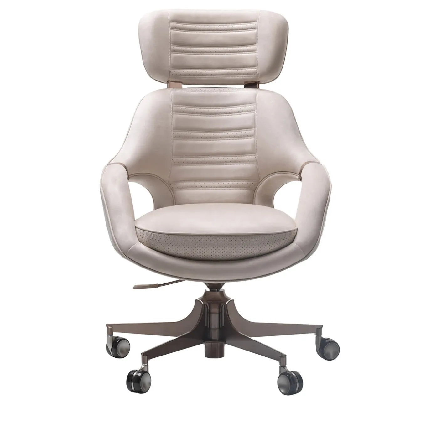 The Stilgar office chair exudes sophistication with its Sean Avorio upholstery and matching pipings. Polished Siena metal accents enhance its refined look, while black nickel leg tips add a modern touch. Designed to blend luxury and functionality, it’s a perfect addition to any executive workspace.