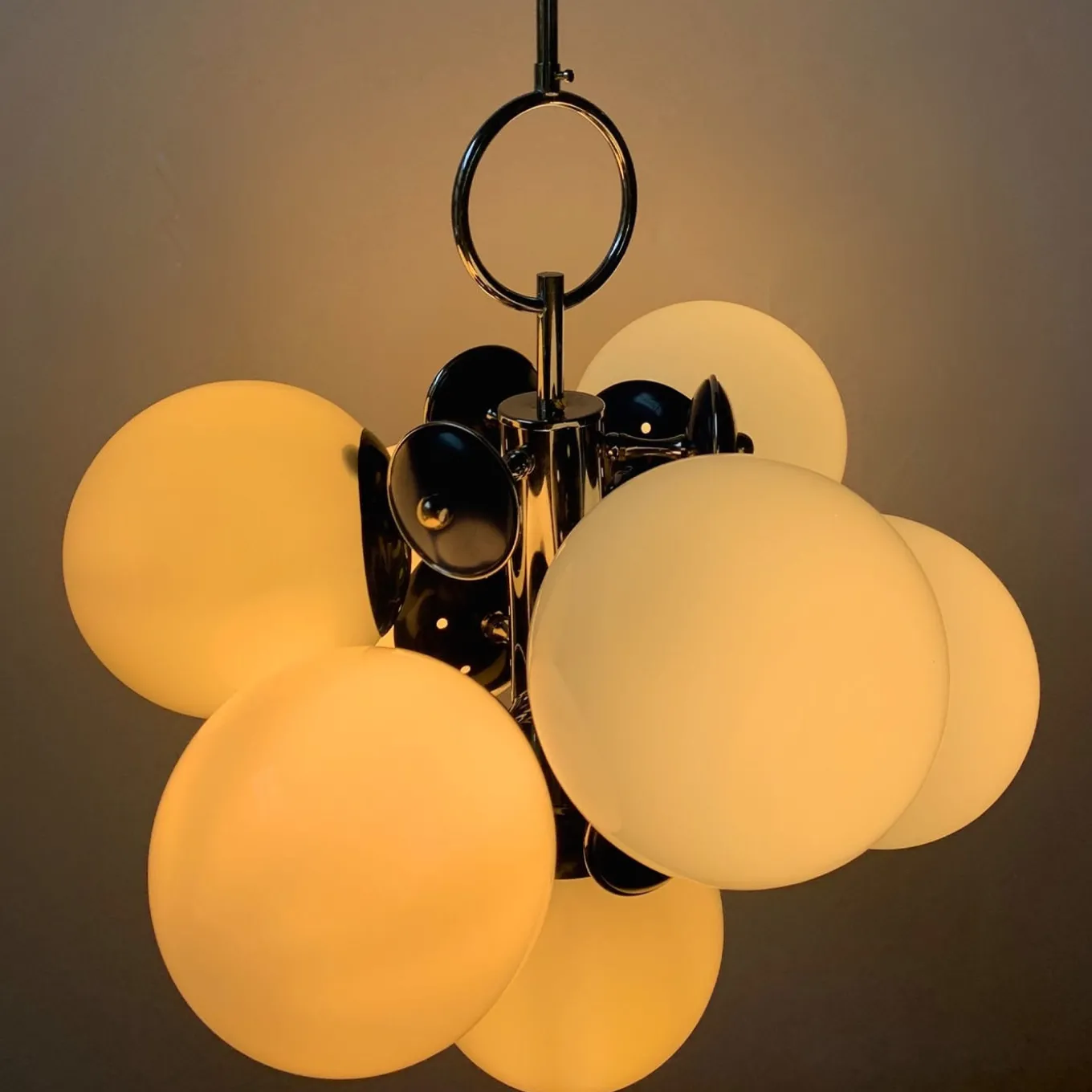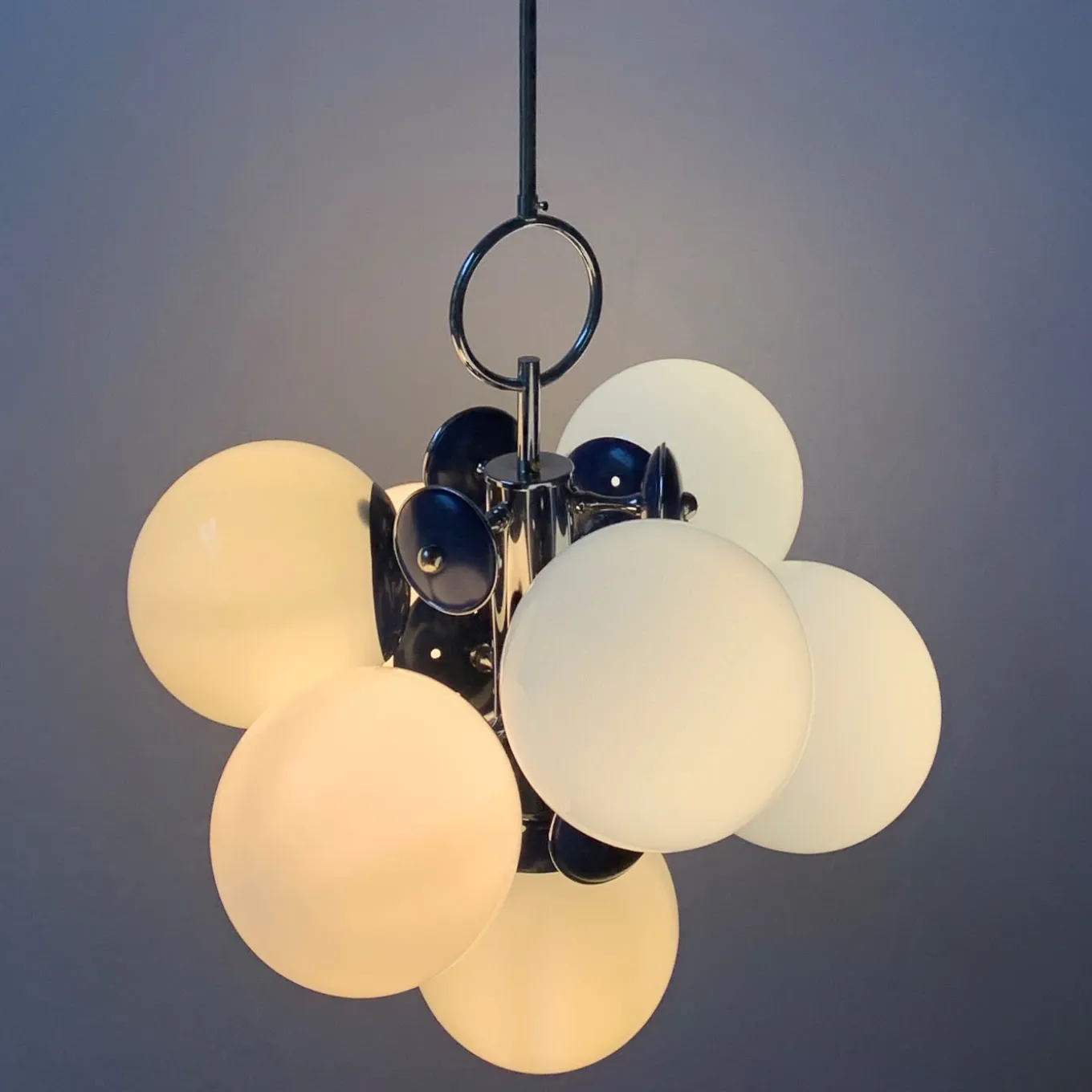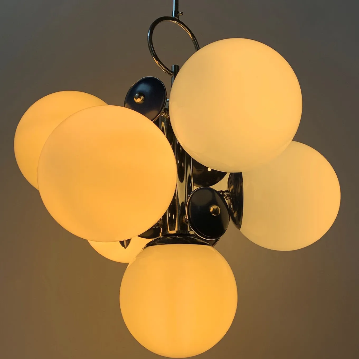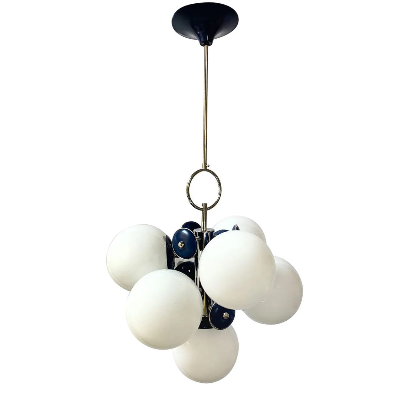 An original 1960s design of timeless sophistication, this Stilnovo chandelier will make for a singular accent to a modern interior. Handmade of mouth-blown Murano glass boasting a milk white tone, it features 7 lampshades (recommended LED bulbs), and a navy blue-lacquered metal structure. Please consult the Concierge for further information and requests.