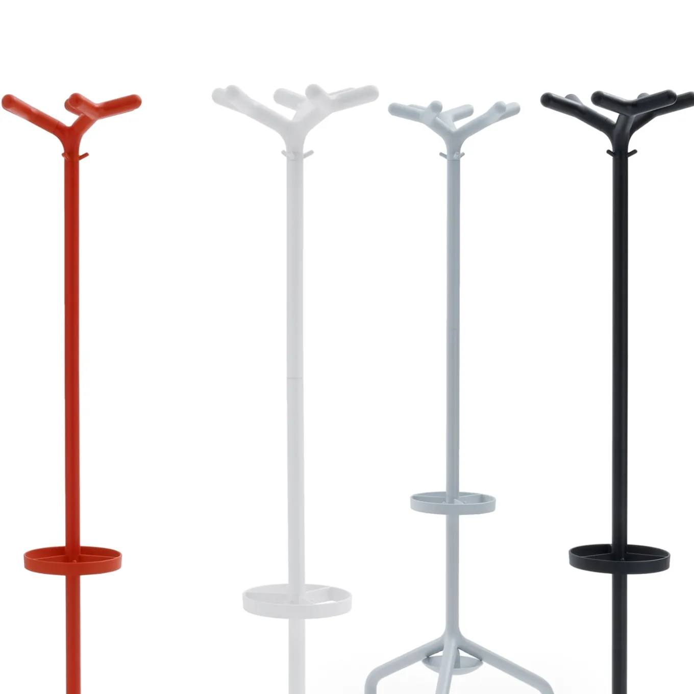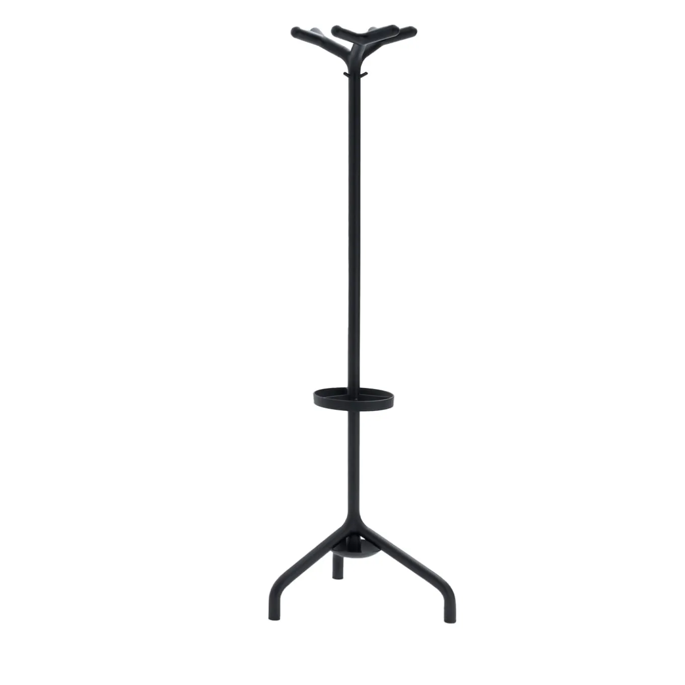 Stilo is a vintage design coat stand consisting of a three-foot frame in painted metal and die-cast aluminum joint. The nine plastic hooks make it easy to hang bags and clothing. A plastic ring and tray can be mounted to the frame to make a convenient umbrella stand. Standing coat rack with umbrella stand in tubular steel diam. 35 cm, black finish.